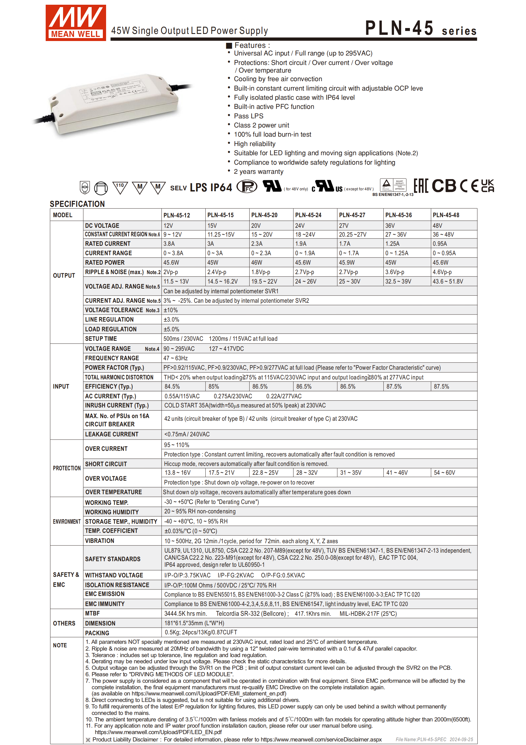 | PLN-45-12 | 12V | 3.8A | 45.6W | 2Vp-p | 11.5~13V |