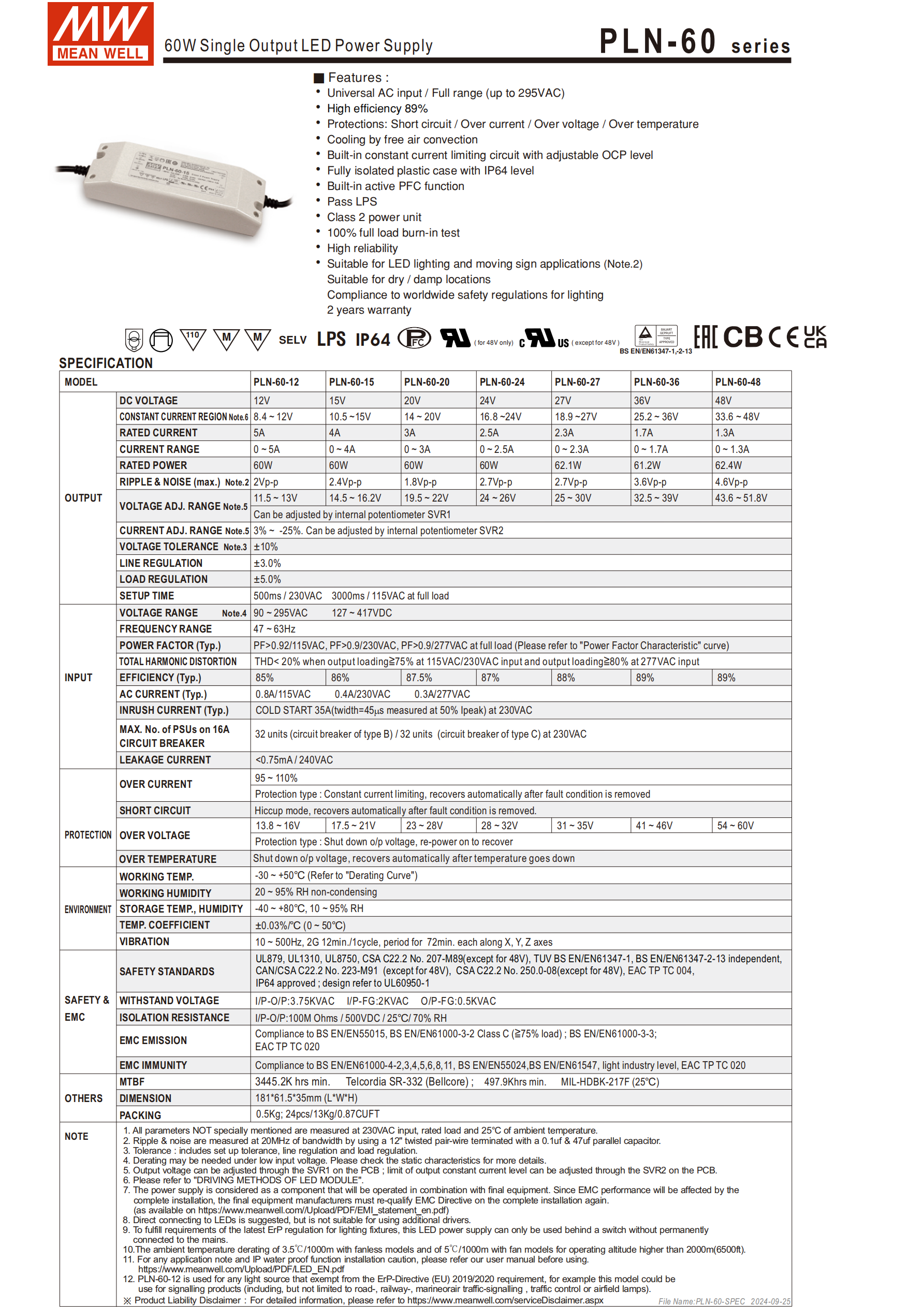 | PLN-60-48 | 48V | 1.3A | 62.4W | 33.6~48V | 4.6Vp-p | 43.6~51.8V |