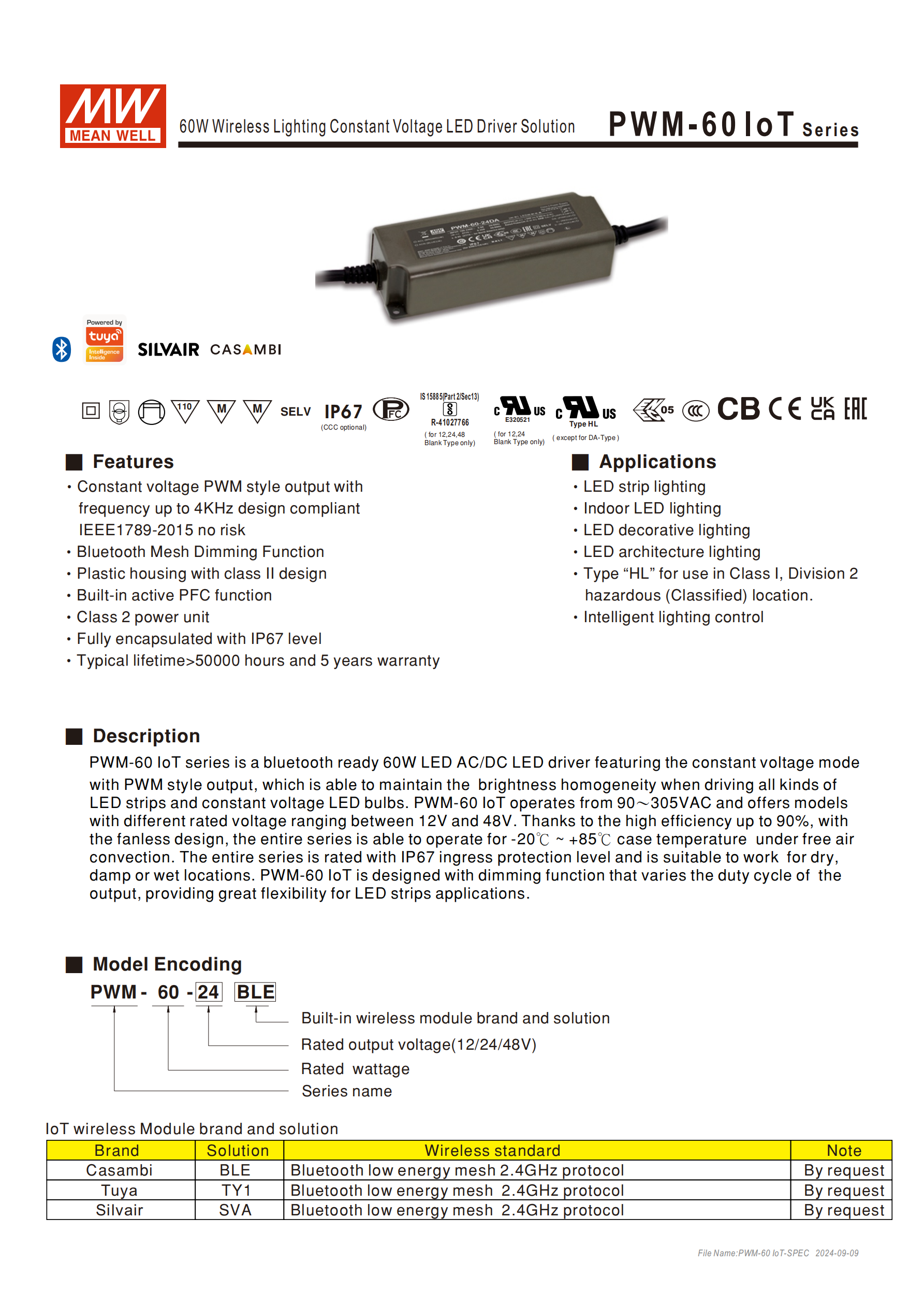 明緯 PWM-60 IoT 系列是 60W 無線恒壓 PWM 式 LED 驅(qū)動器,具備藍牙調(diào)光功能,支持 90~305Vac 全范圍交流輸入,提供 12V/24V/48V 三種額定輸出電壓,轉(zhuǎn)換效率最高達90%,防護等級為IP67,工作溫度范圍 - 20℃~+85℃,壽命超50000 小時且享 5 年保固;內(nèi)置 Casambi/Silvair/Tuya 藍牙低能耗 2.4GHZ 模塊(可選購),調(diào)光范圍 0~100%(最低 1%),無線控制距離 20 米,符合 IEEE 1789-2015 等多項標準,適用于 LED 燈帶、室內(nèi)及建筑照明等場景,還可用于 Class I, Division 2 類危險地點照明。