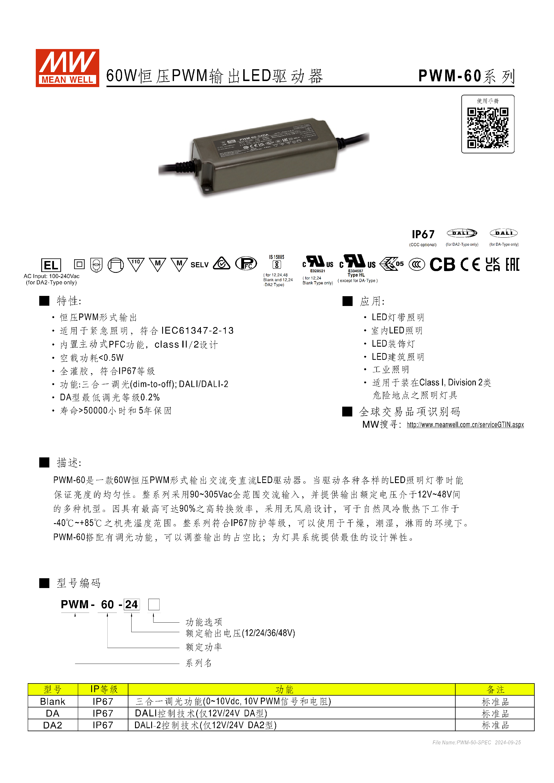 明緯PWM-60 系列是 60W 恒壓 PWM 輸出 LED 驅(qū)動器,具備90~305Vac 全范圍交流輸入、IP67 防護等級,輸出額定電壓分 12/24/36/48V 四檔,搭載主動式 PFC,轉(zhuǎn)換效率最高達90%,支持三合一調(diào)光(空白型)、DALI/DALI-2 調(diào)光(DA/DA2 型,DA 型最低調(diào)光 0.2%),全灌膠設(shè)計可在 **-40℃~+85℃機殼溫度工作,空載功耗 < 0.5W,壽命超50000 小時 ** 且提供 5 年保固,適配 LED 燈帶、室內(nèi)外裝飾及工業(yè)照明等場景,還符合多項安規(guī)與電磁兼容標準,具備過載、短路、過壓、過溫全方面保護功能。