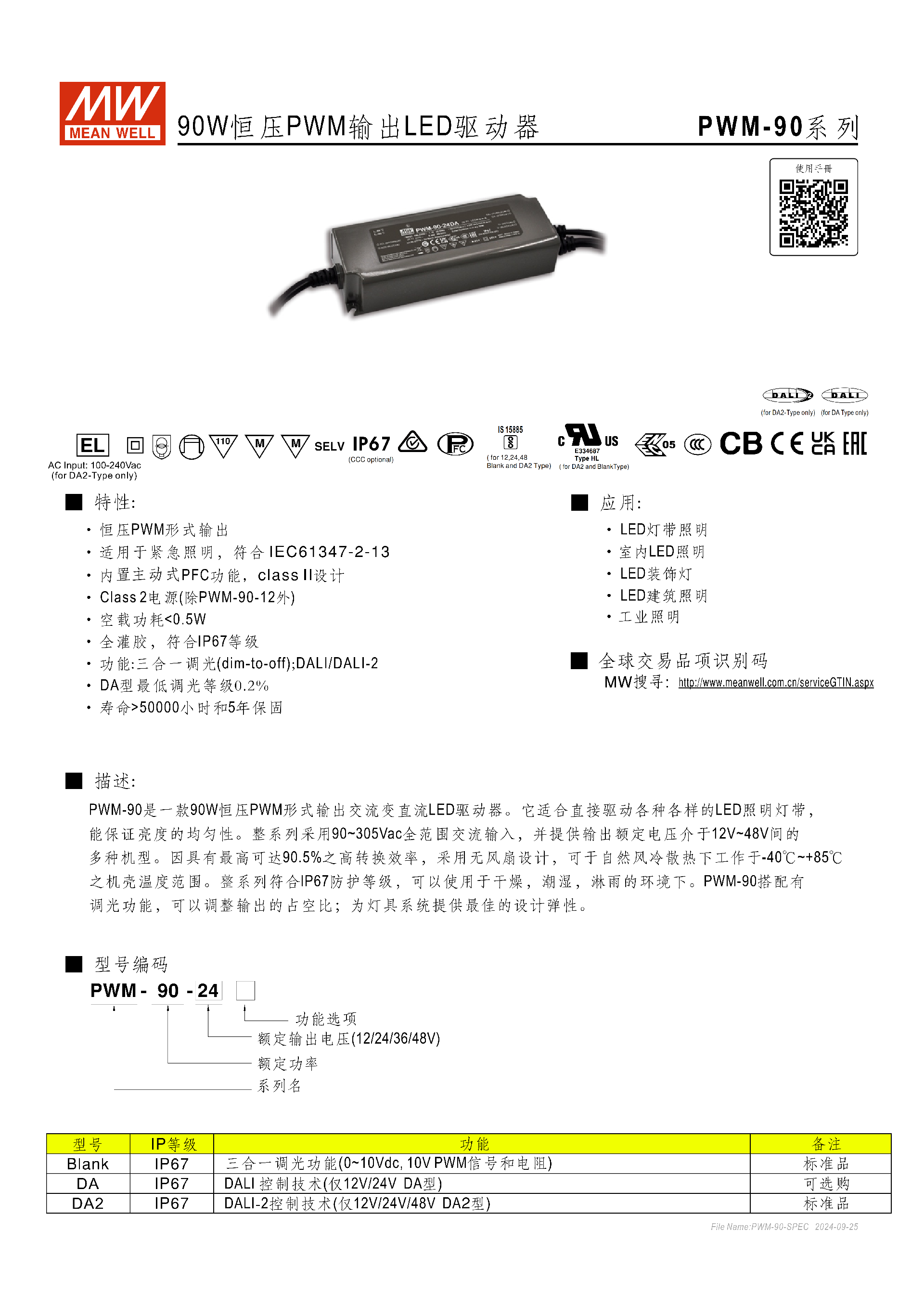 明緯PWM-90 系列是 90W 恒壓 PWM 輸出的 LED 驅動器,采用90~305Vac全范圍交流輸入,輸出額定電壓涵蓋 12V/24V/36V/48V,具備IP67全灌膠防護等級,支持三合一調光(空白型)、DALI/DAli-2 調光(DA/DA2 型,DA 型最低調光 0.2%),內置主動式 PFC 功能,轉換效率最高達90.5%,工作殼溫范圍 **-40℃~+85℃**,空載功耗 < 0.5W,壽命超 50000 小時,適配 LED 燈帶、室內外裝飾及工業(yè)照明等場景,且符合 IEC61347-2-13 等多項國際安全與電磁兼容標準。