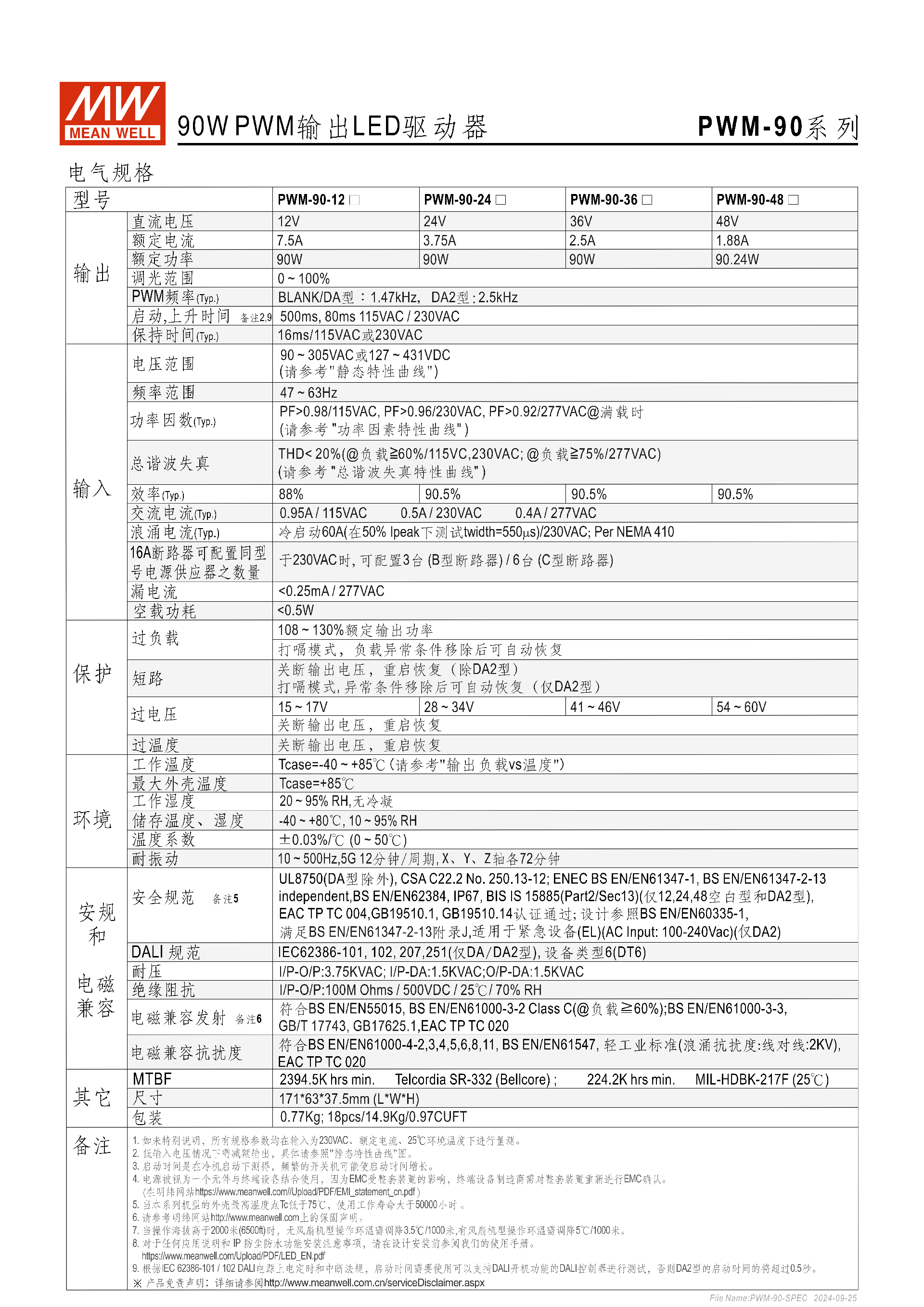 | PWM-90-12 | 12V | 7.5A | 90W | Blank/DA(DALI) | 1.47kHz |