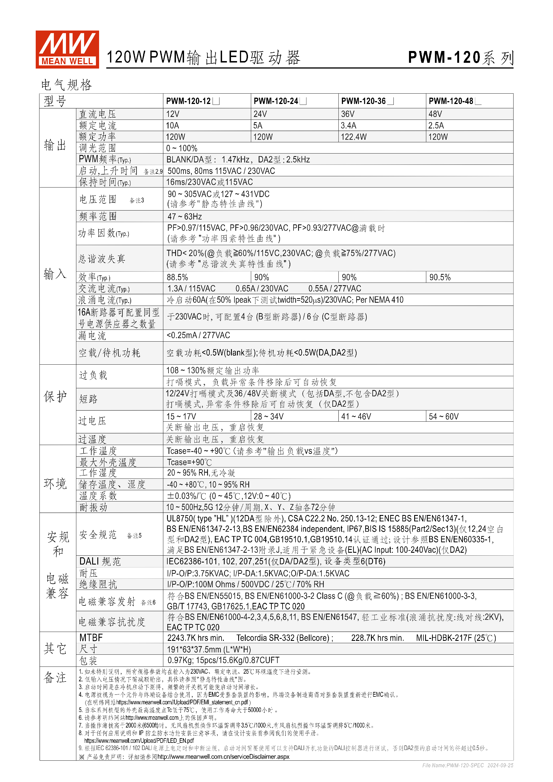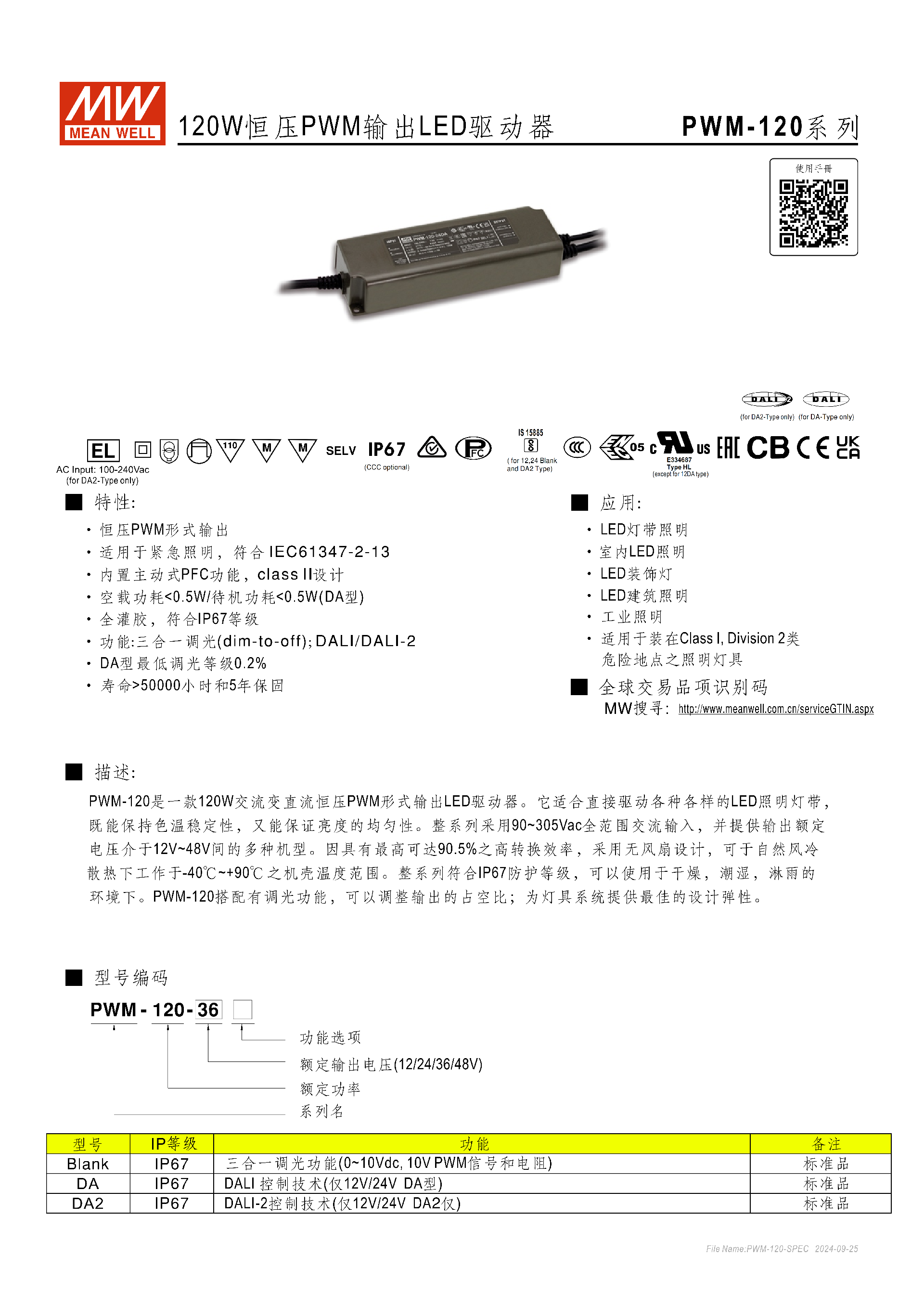 明緯PWM-120 系列是 120W 恒壓 PWM 輸出 LED 驅動器,具備90~305Vac 全范圍交流輸入、IP67全灌膠防護等級,輸出額定電壓涵蓋 12V/24V/36V/48V,轉換效率最高達90.5%,支持三合一調(diào)光(空白型)、DALI/DALI-2 調(diào)光(DA/DA2 型,DA 型最低調(diào)光等級 0.2%),工作溫度范圍 - 40℃~+90℃,壽命超50000 小時,內(nèi)置主動式 PFC,空載 / 待機功耗 < 0.5W,適配 LED 燈帶、建筑照明等多種場景,且符合多項國際安規(guī)認證,可在干燥、潮濕、淋雨環(huán)境及 Class I, Division 2 類危險地點使用。