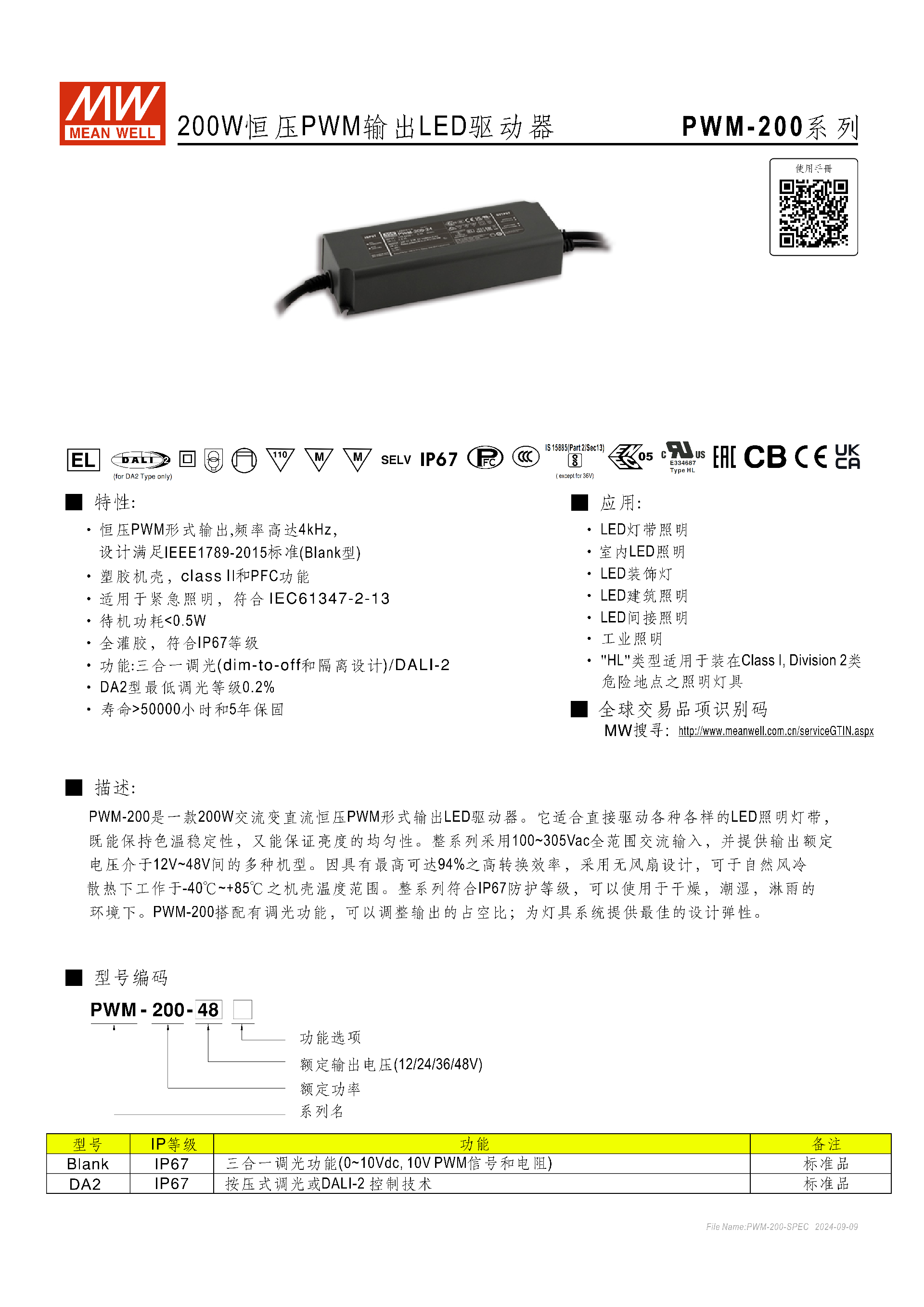 明緯PWM-200 系列是 200W 級IP67 防護的恒壓 PWM 輸出 LED 驅(qū)動器,采用 100~305Vac 全范圍交流輸入,提供 12V/24V/36V/48V 四種額定輸出電壓,轉(zhuǎn)換效率最高達94%,具備三合一調(diào)光(Blank 型)和DALI-2 / 按壓式調(diào)光(DA2 型)兩種調(diào)光方案,DA2 型最低調(diào)光等級達0.2%,PWM 輸出頻率 Blank 型為 4kHz、DA2 型為 2.5kHz,工作溫度范圍 **-40℃~+85℃**,待機功耗 < 0.5W,壽命超 50000 小時,通過 UL8750、ENEC 等多項安規(guī)認證,適用于 LED 燈帶、建筑照明、工業(yè)照明等多種場景,HL 類型還可用于 Class I, Division 2 類危險地點。