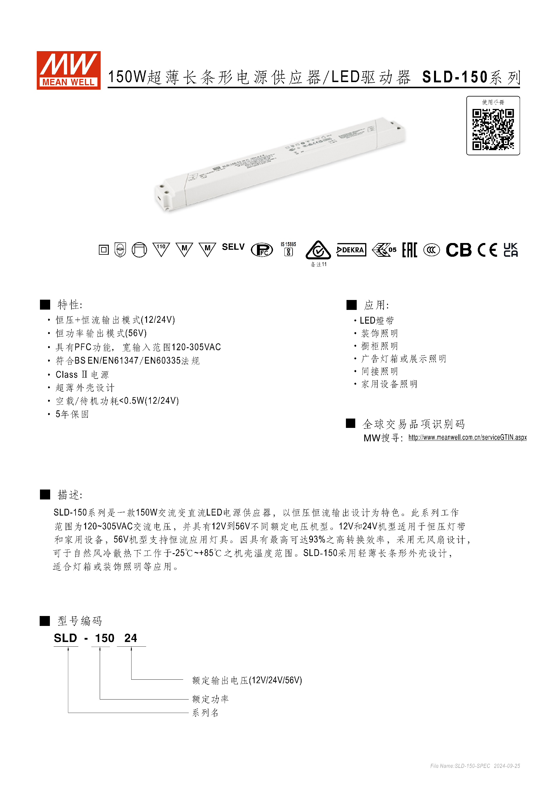 明緯SLD-150 系列是 150W 超薄長條形 LED 電源供應器 / 驅(qū)動器,分12V/24V/56V三款機型,12/24V 支持恒壓 + 恒流、56V 為恒功率輸出模式,輸入電壓范圍120-305VAC且?guī)?PFC 功能,轉(zhuǎn)換效率最高達93%,采用無風扇自然風冷設計,工作機殼溫度 **-25℃~+85℃,外殼尺寸3303522mm**,具備過流、短路、過壓、過溫多重保護,空載功耗 **<0.5W**,擁有 5 年保固,適配 LED 燈帶、裝飾照明等商業(yè)照明場景,通過 ENEC、GB 等多項安規(guī)認證,MTBF 最低達298.8K 小時。