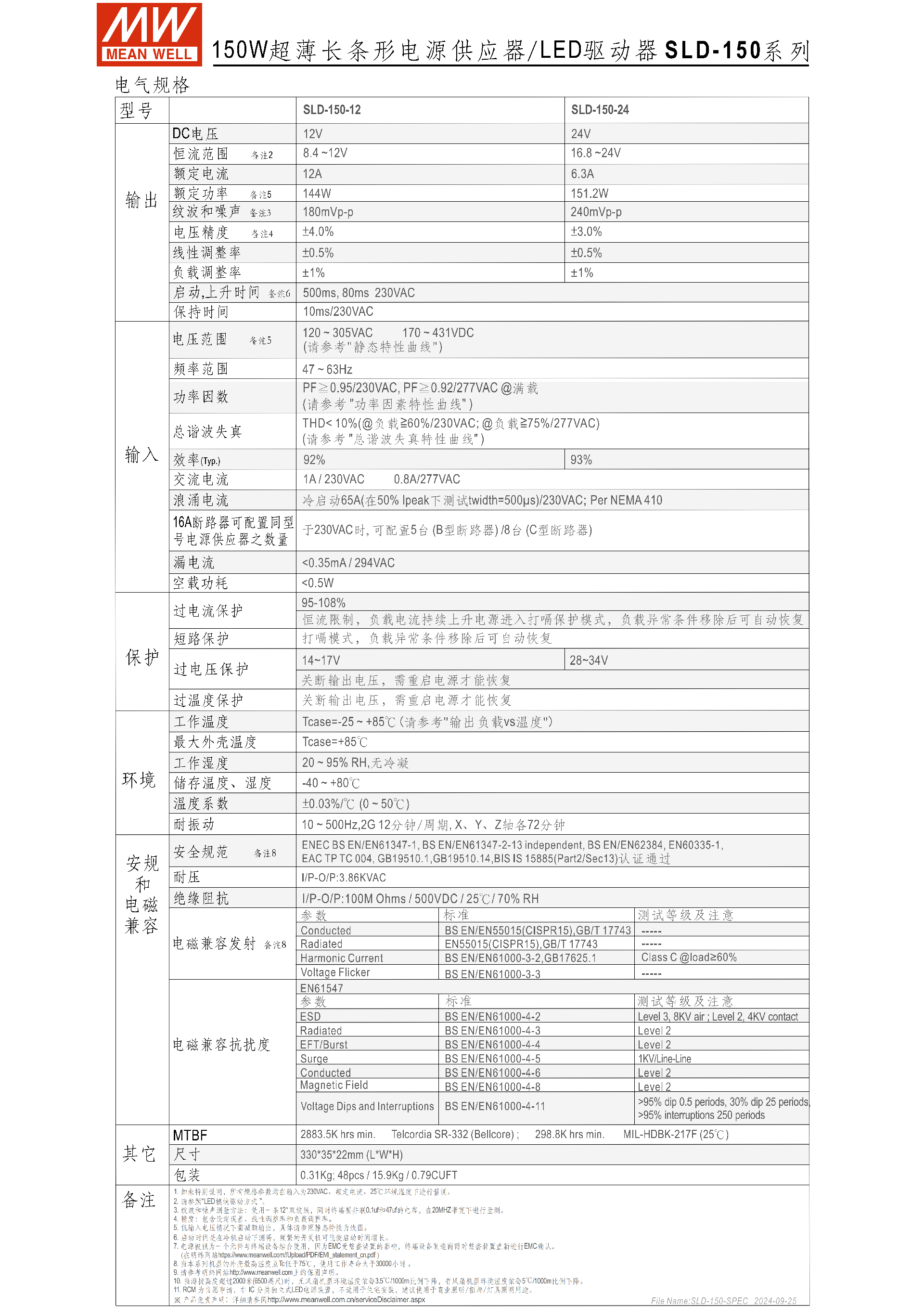 明緯SLD-150 系列是 150W 超薄長條形 LED 電源供應器 / 驅動器,分12V/24V/56V三款機型,12/24V 支持恒壓 + 恒流、56V 為恒功率輸出模式,輸入電壓范圍120-305VAC且?guī)?PFC 功能,轉換效率最高達93%,采用無風扇自然風冷設計,工作機殼溫度 **-25℃~+85℃,外殼尺寸3303522mm**,具備過流、短路、過壓、過溫多重保護,空載功耗 **<0.5W**,擁有 5 年保固,適配 LED 燈帶、裝飾照明等商業(yè)照明場景,通過 ENEC、GB 等多項安規(guī)認證,MTBF 最低達298.8K 小時。
