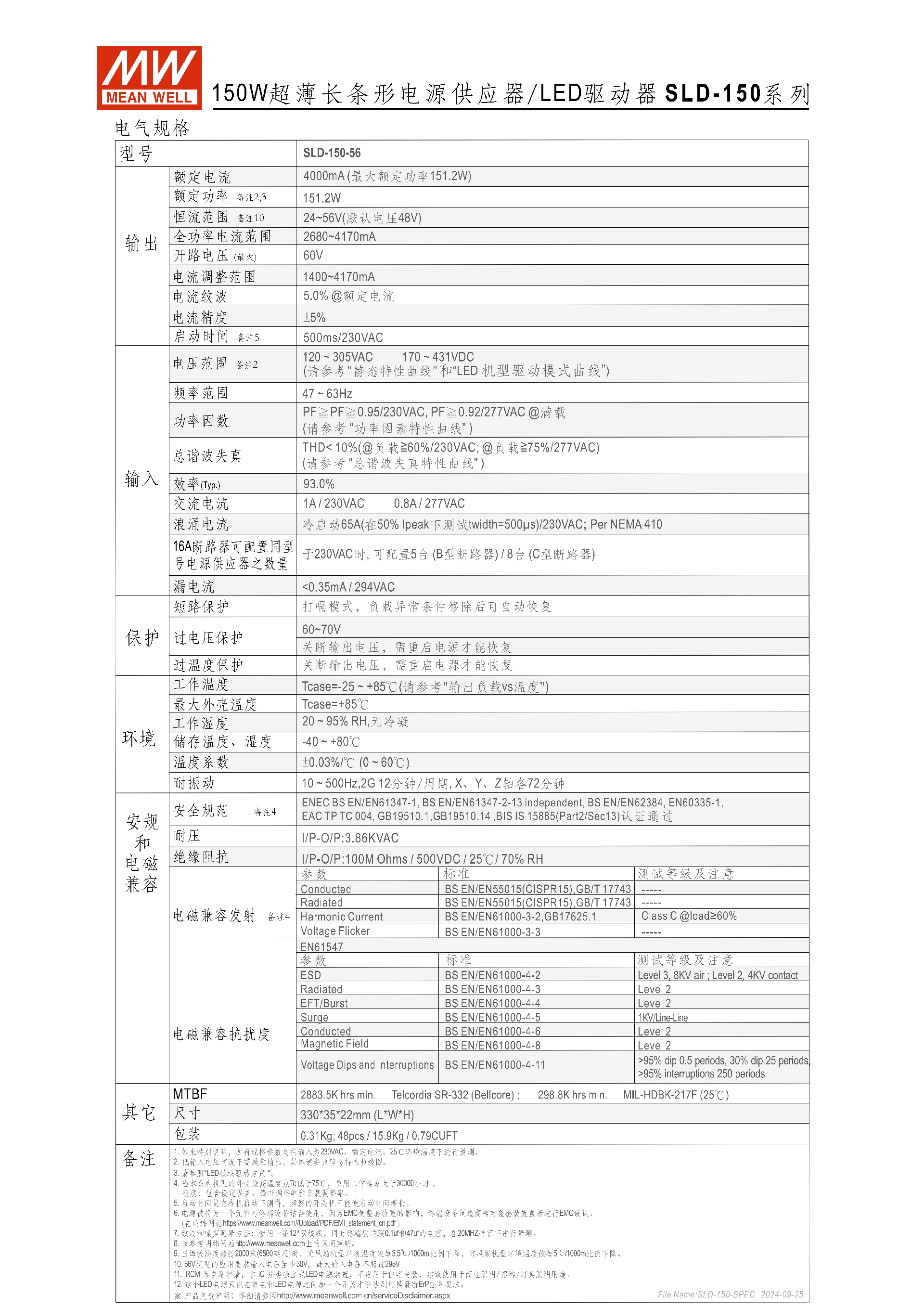 | SLD-150-56 | 56V (默認 48V) | 4000mA | 151.2W | 24~56V | - | - |