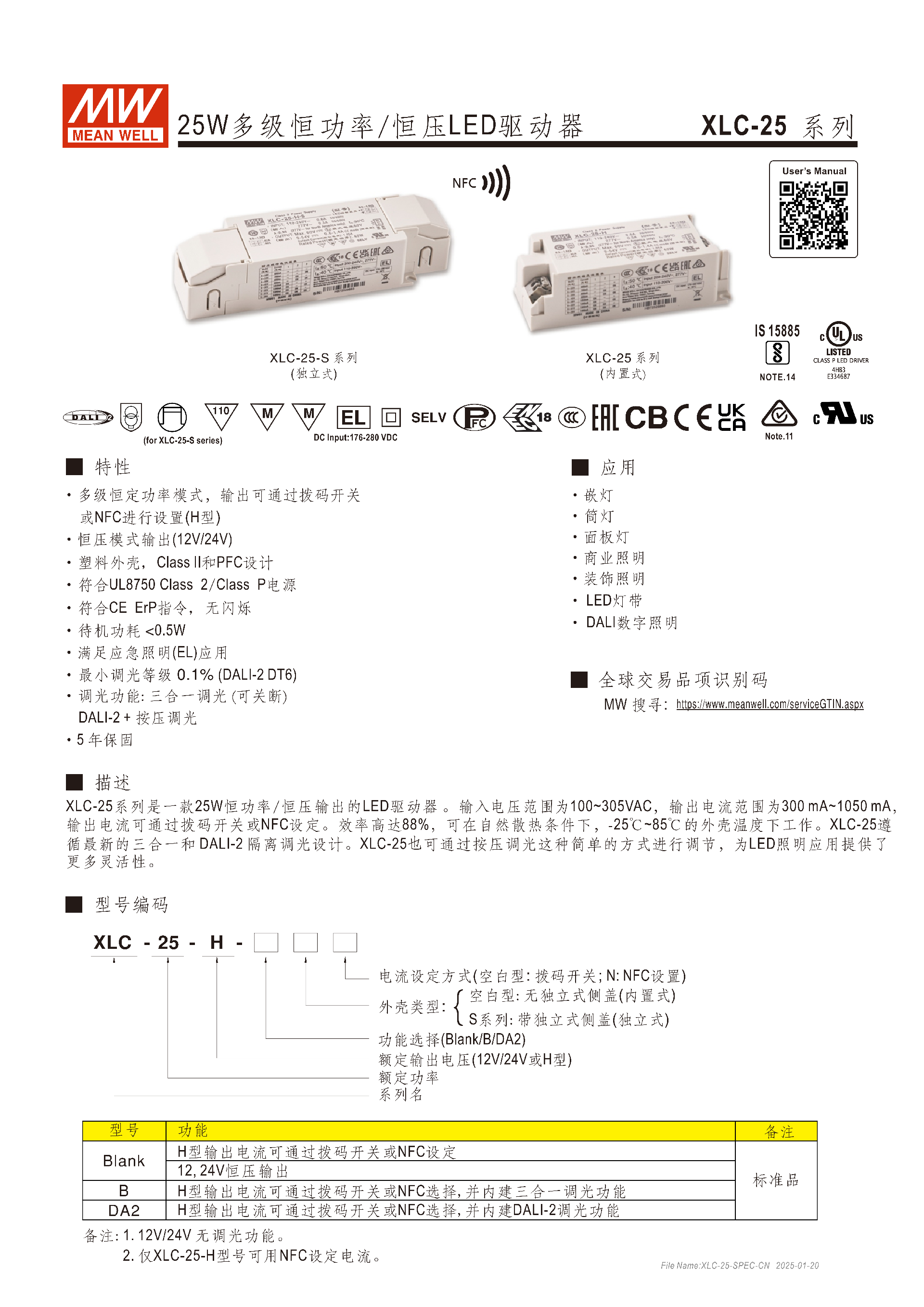 明緯XLC-60-MA 系列是 60W 的恒功率 / 恒壓雙模式 LED 驅(qū)動(dòng)器,分內(nèi)置型 (MA)和帶應(yīng)力消除的獨(dú)立型 (MAS)兩大類型,輸入支持100~305VAC/155~400VDC,恒壓款輸出為 12/24/48V 對(duì)應(yīng) 5A/2.5A/1.25A,恒功率 H 型可通過 DIP 開關(guān)將輸出電流在0.9~1.7A間調(diào)節(jié)、恒功率工作電壓 9~54V,具備Matter 1.3無線調(diào)光(調(diào)光低至 0.1%/0.5%)、5 年質(zhì)保,工作殼溫 **-25~90℃,效率最高達(dá)90%**,擁有過載 / 短路 / 過壓 / 過溫等完善保護(hù),同時(shí)符合 EMC / 安全相關(guān)標(biāo)準(zhǔn),適配商業(yè)、裝飾、LED 燈帶等多種照明場(chǎng)景。