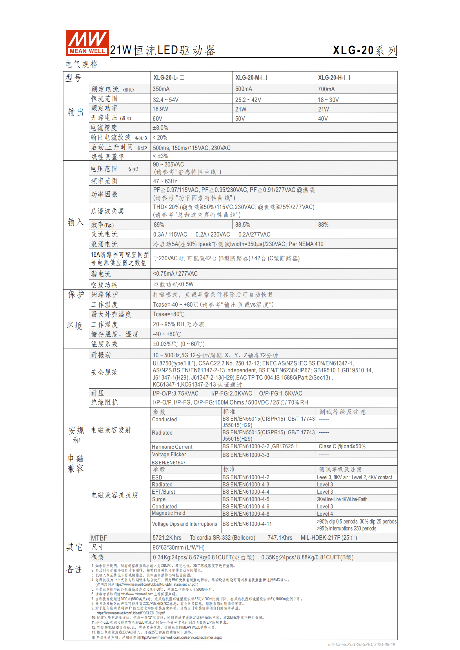 XLG-20-L-:350mA,輸出電壓 32.4~54V,開路電壓 60V;