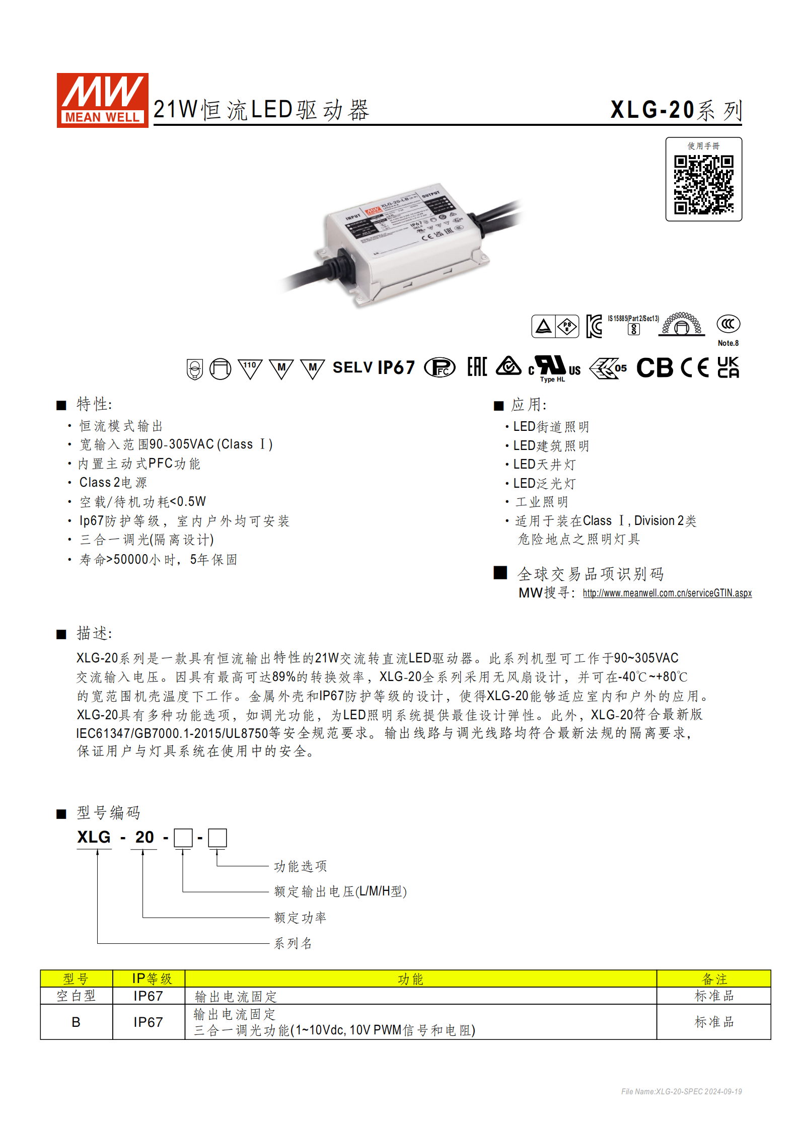 明緯 XLG-20 系列是21W 恒流 LED 驅(qū)動器,具備90-305VAC 寬輸入范圍、IP67 防護等級與主動式 PFC 功能,分空白型和 B 型(三合一調(diào)光),轉(zhuǎn)換效率最高達89%,可在 **-40℃~+80℃機殼溫度工作,空載功耗 <0.5W,壽命超50000 小時 ** 且享 5 年保固,符合 IEC61347 等多項安全規(guī)范,適配 LED 街道、建筑、工業(yè)等照明場景,還可用于 Class Ⅰ Division 2 類危險地點照明。