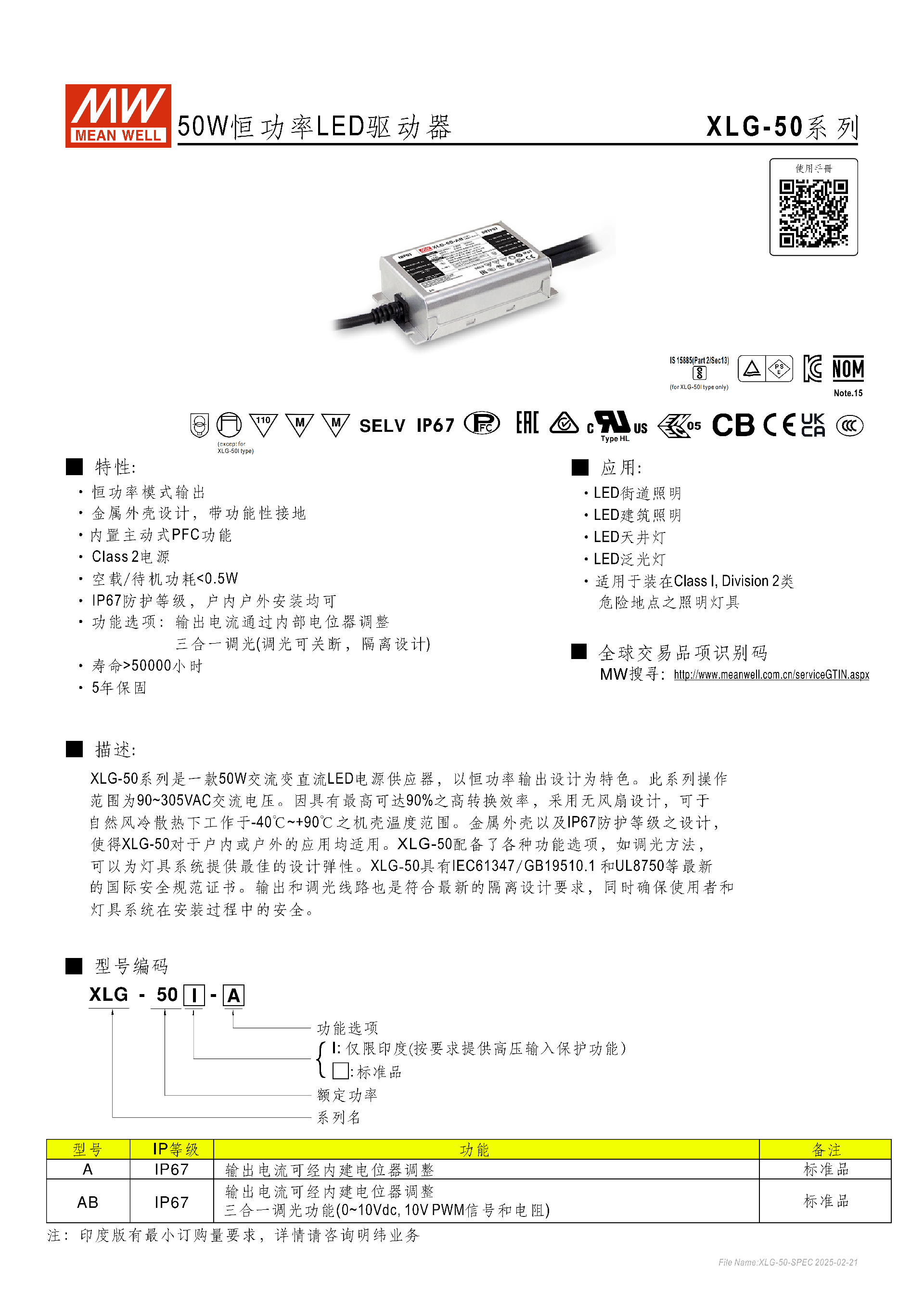 | XLG-50I | - | 高壓輸入保護,適配印度市場 | 印度專用,有最小訂購量要求 |