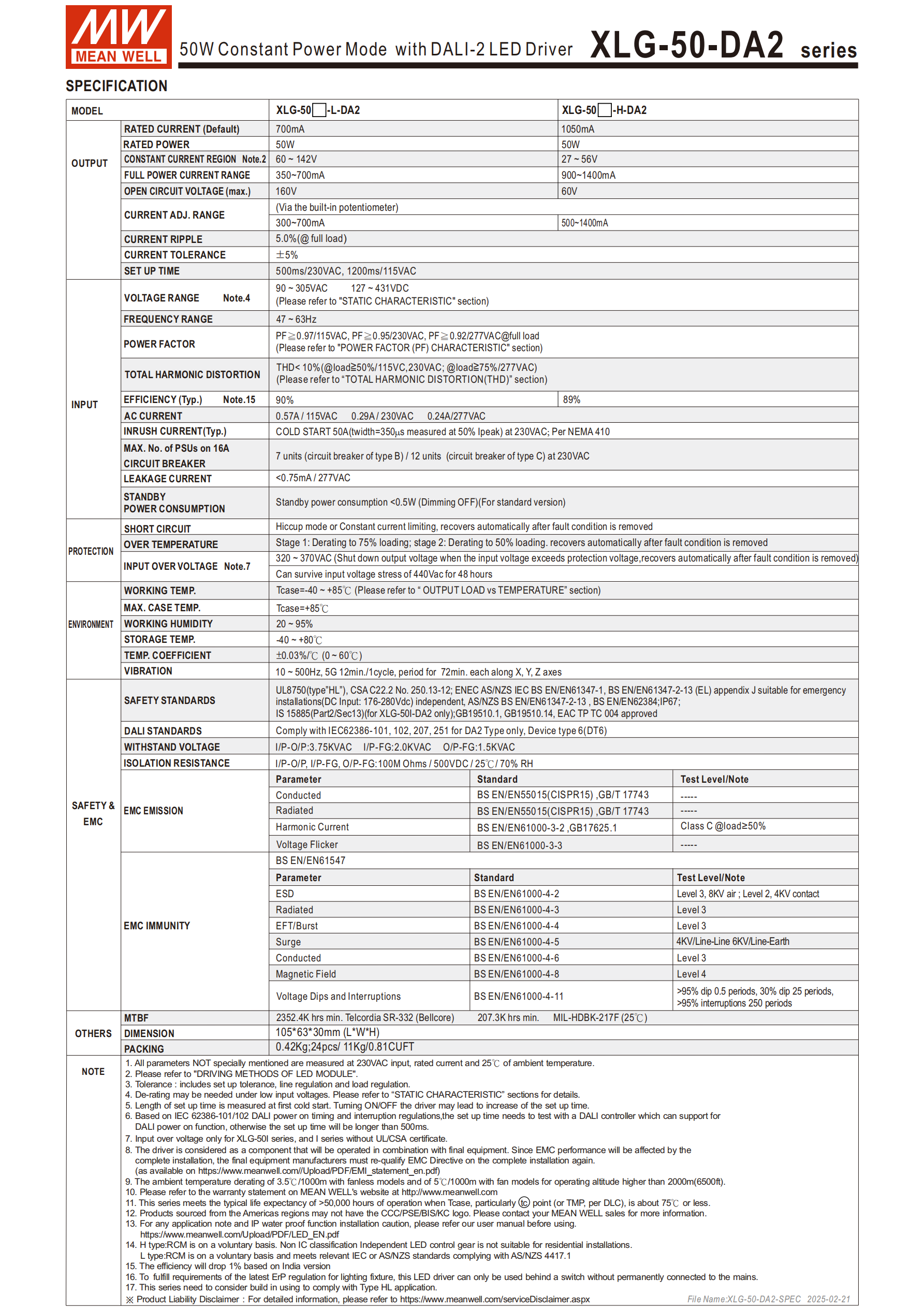 明緯XLG-50-DA2 系列是 50W 恒功率模式的 DALI-2 LED 驅(qū)動(dòng)電源,分 L/H 型及印度定制 I 型,輸入電壓涵蓋90~305VAC/127~431VDC,具備IP67防護(hù)等級(jí),工作溫度寬至 **-40℃~85℃,搭載 DALI-2 調(diào)光(最低 8% 亮度)、內(nèi)置主動(dòng) PFC,待機(jī)功耗<0.5W**,效率最高達(dá) 89%,擁有短路、過(guò)溫、過(guò)壓等多重保護(hù),適配室內(nèi)外 LED 照明場(chǎng)景,符合 IEC61347 等國(guó)際安全標(biāo)準(zhǔn),提供5 年質(zhì)保,典型使用壽命超 50000 小時(shí)。