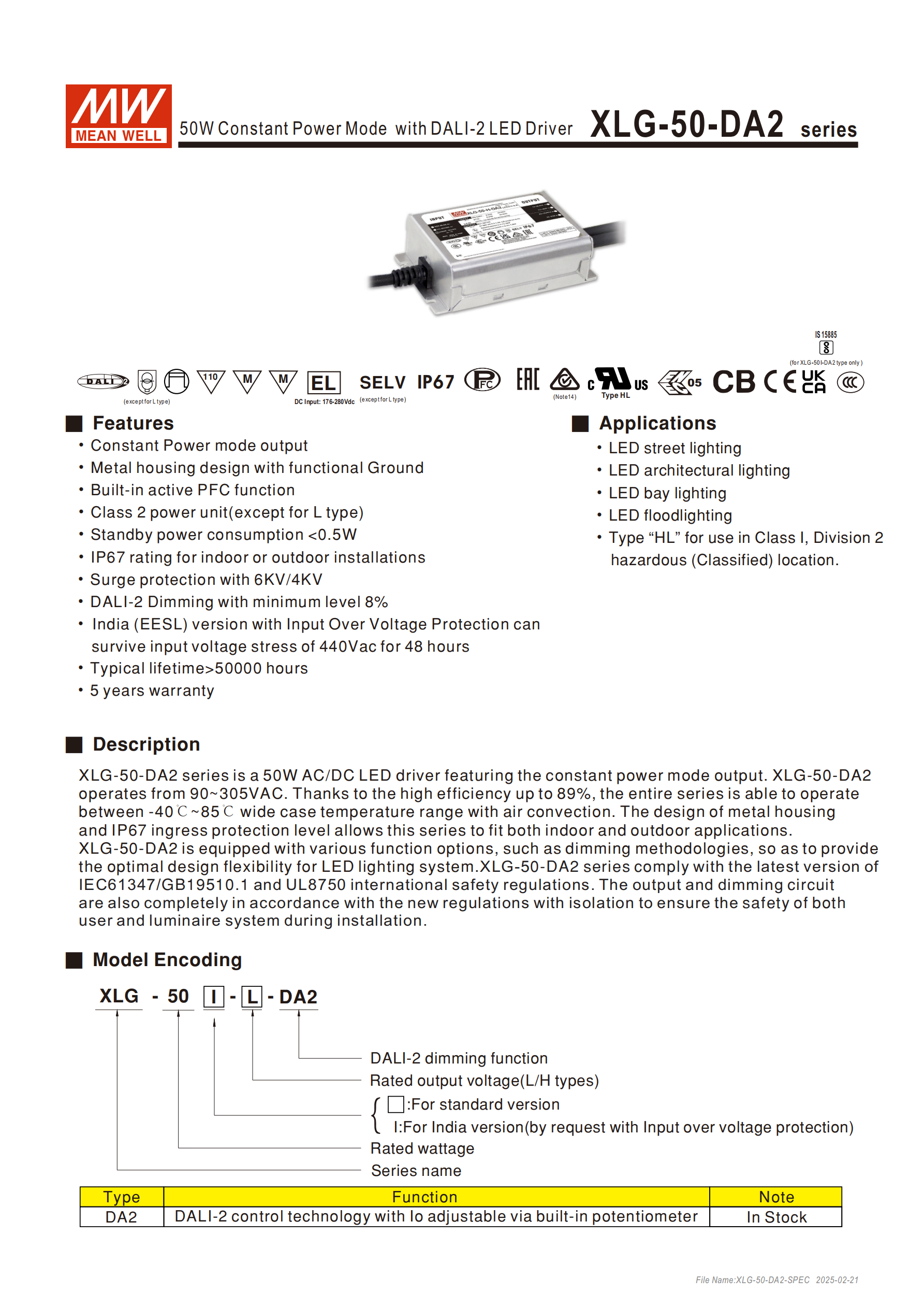 明緯XLG-50-DA2 系列為50W 恒功率模式的 DALI-2 LED 驅(qū)動(dòng)電源,是 AC/DC 轉(zhuǎn)換型驅(qū)動(dòng),采用金屬外殼設(shè)計(jì)并帶功能性接地,適配室內(nèi)外 LED 照明安裝,具備高防護(hù)、寬溫工作、智能調(diào)光等特性,完全符合 IEC61347/GB19510.1、UL8750 等國(guó)際安全規(guī)范,輸出和調(diào)光電路做隔離設(shè)計(jì),保障安裝及使用安全,提供5 年質(zhì)保,典型使用壽命 **>50000 小時(shí) **(外殼溫度≤75℃時(shí))。