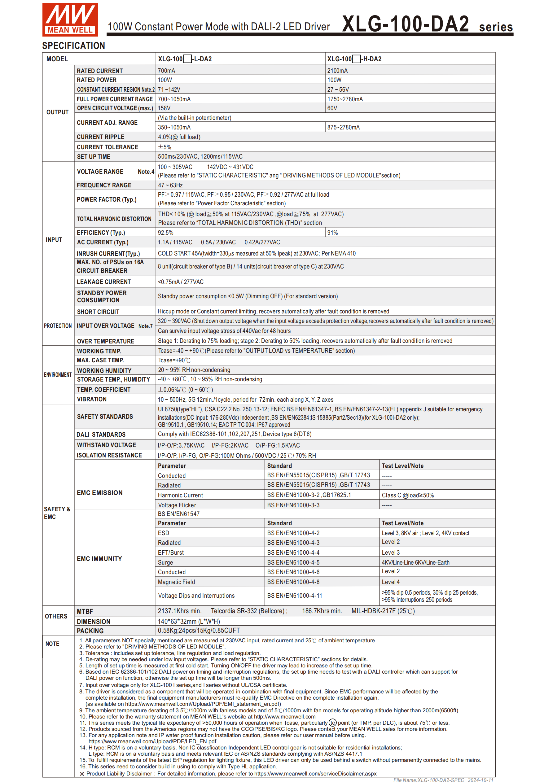 問題 2:XLG-100-DA2 系列的 DALI-2 調(diào)光特性及輸出電流調(diào)節(jié)相關(guān)參數(shù)是什么?