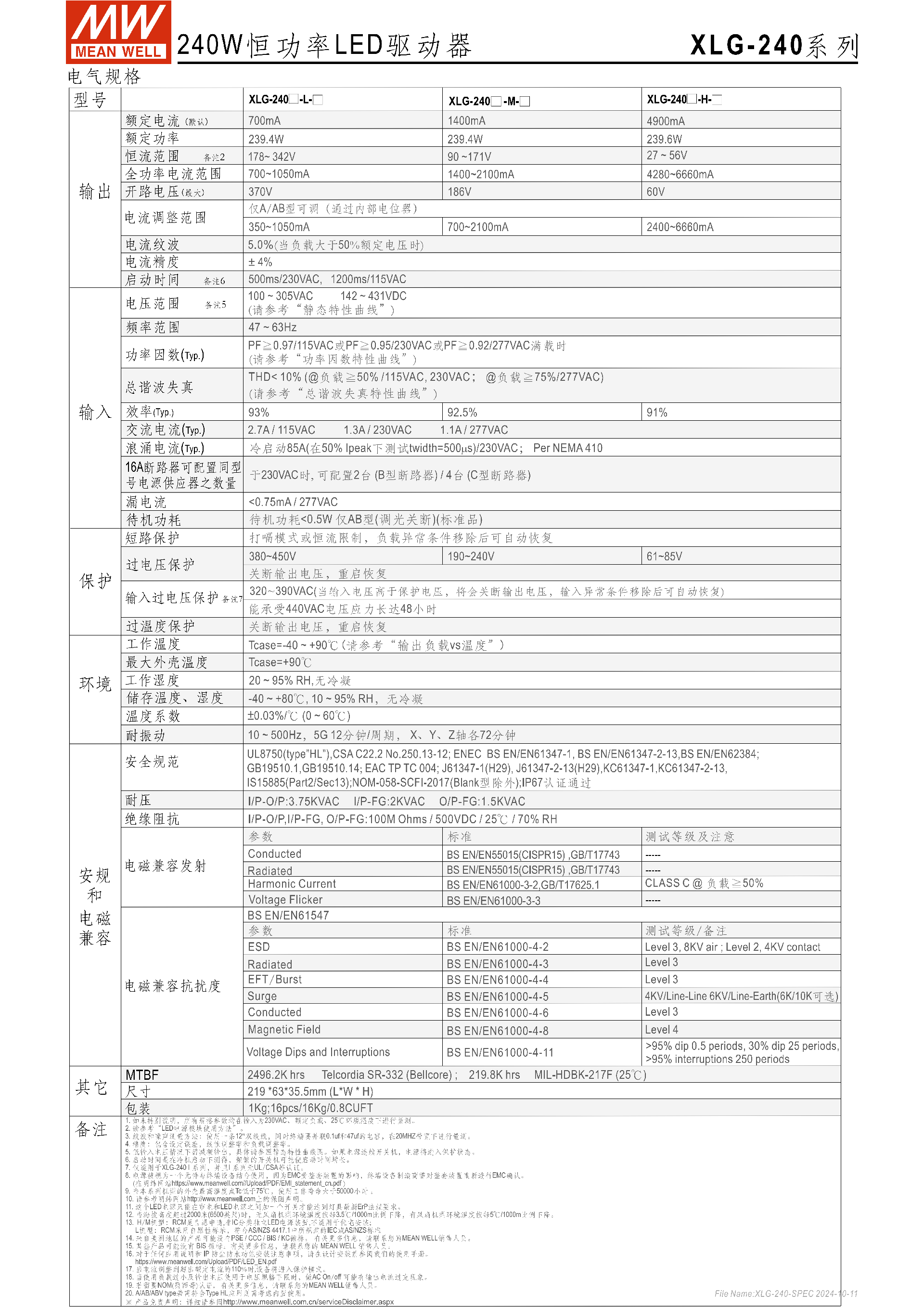 明緯 XLG-240 系列為240W交流轉(zhuǎn)直流 LED 電源供應(yīng)器,主打恒功率模式(48V 型為恒壓模式),是適配戶內(nèi)外多場(chǎng)景的高防護(hù) LED 驅(qū)動(dòng)器,通過 IEC61347/GB19510.1、UL8750 等最新國際安全規(guī)范,輸出與調(diào)光線路均為隔離設(shè)計(jì),保障安裝與使用安全,壽命>50000 小時(shí)且提供5 年保固。