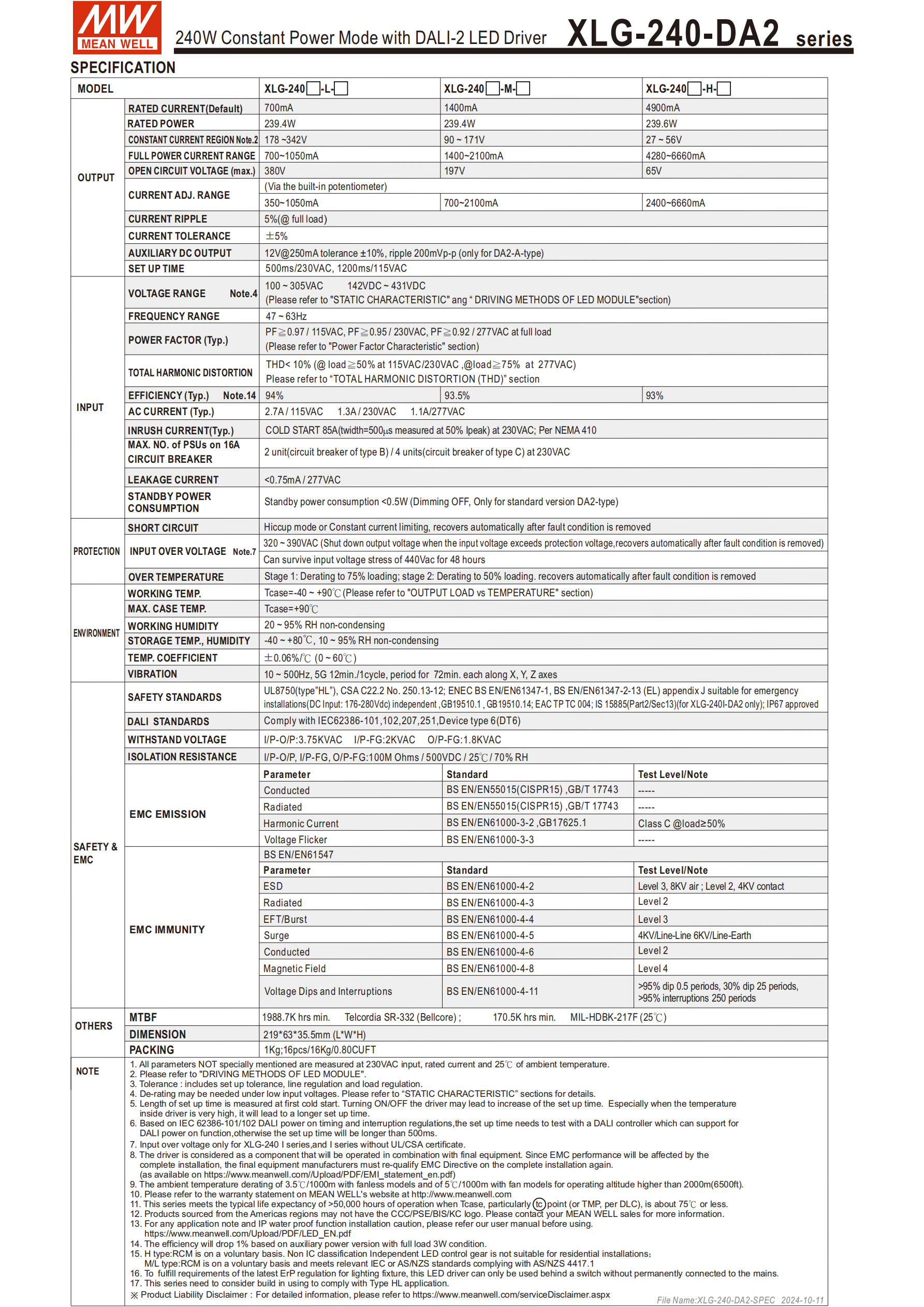 | XLG-240-L- | 700mA | 239.4W | 27~56V | 350~1050mA | 65V |
