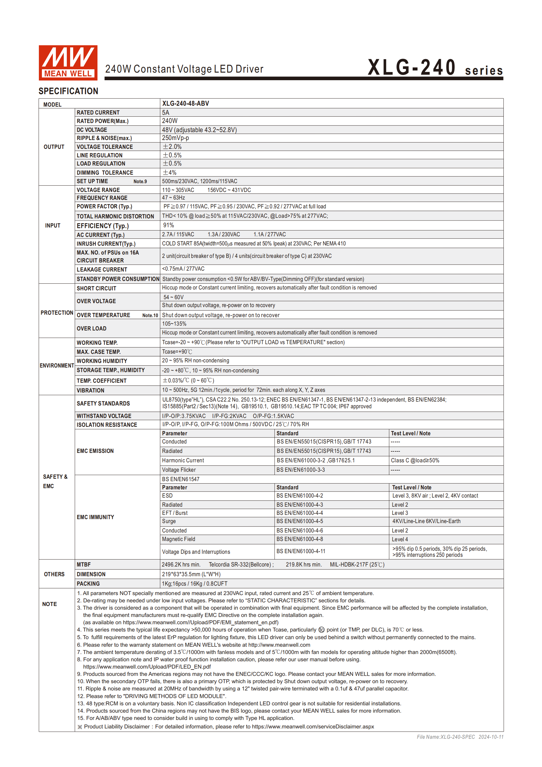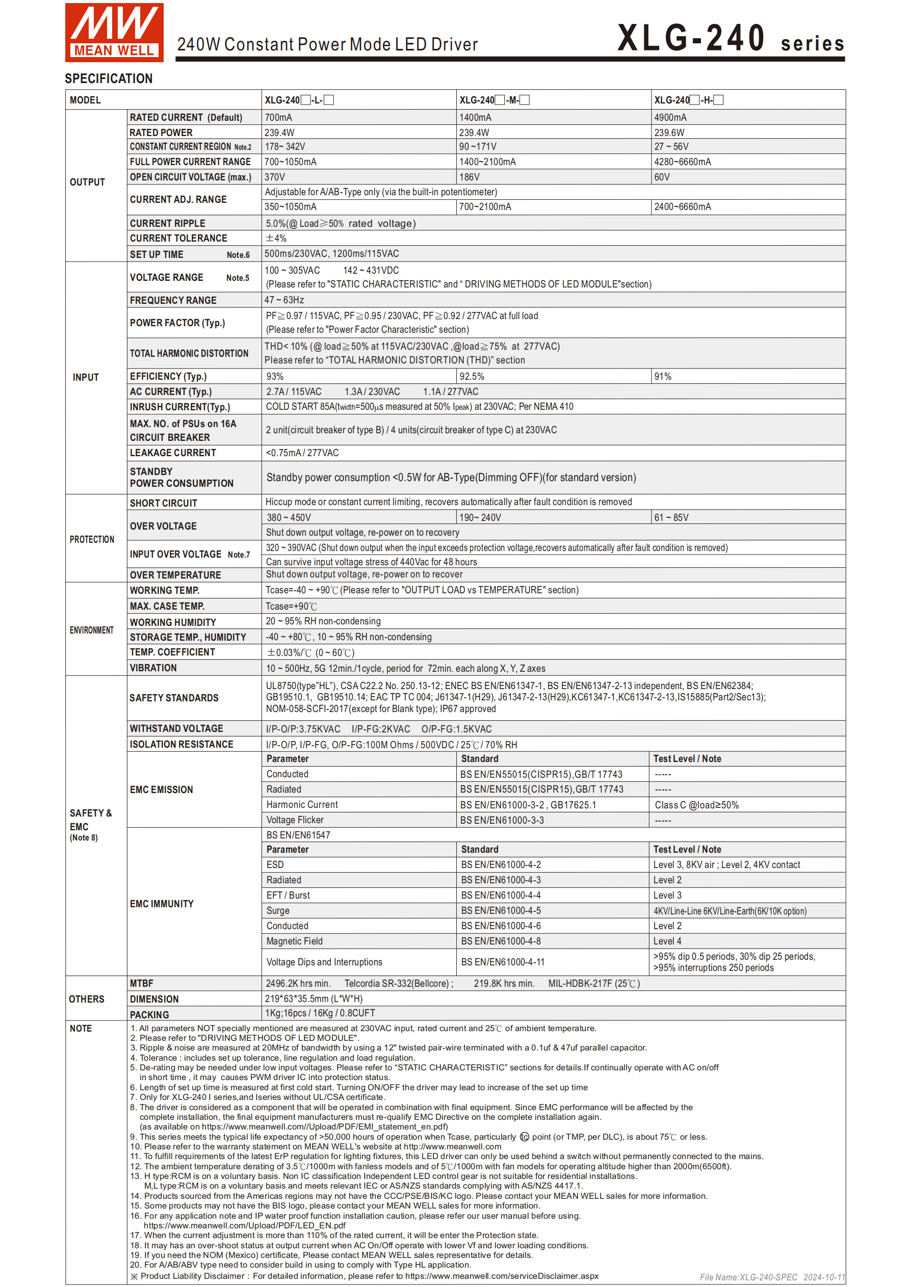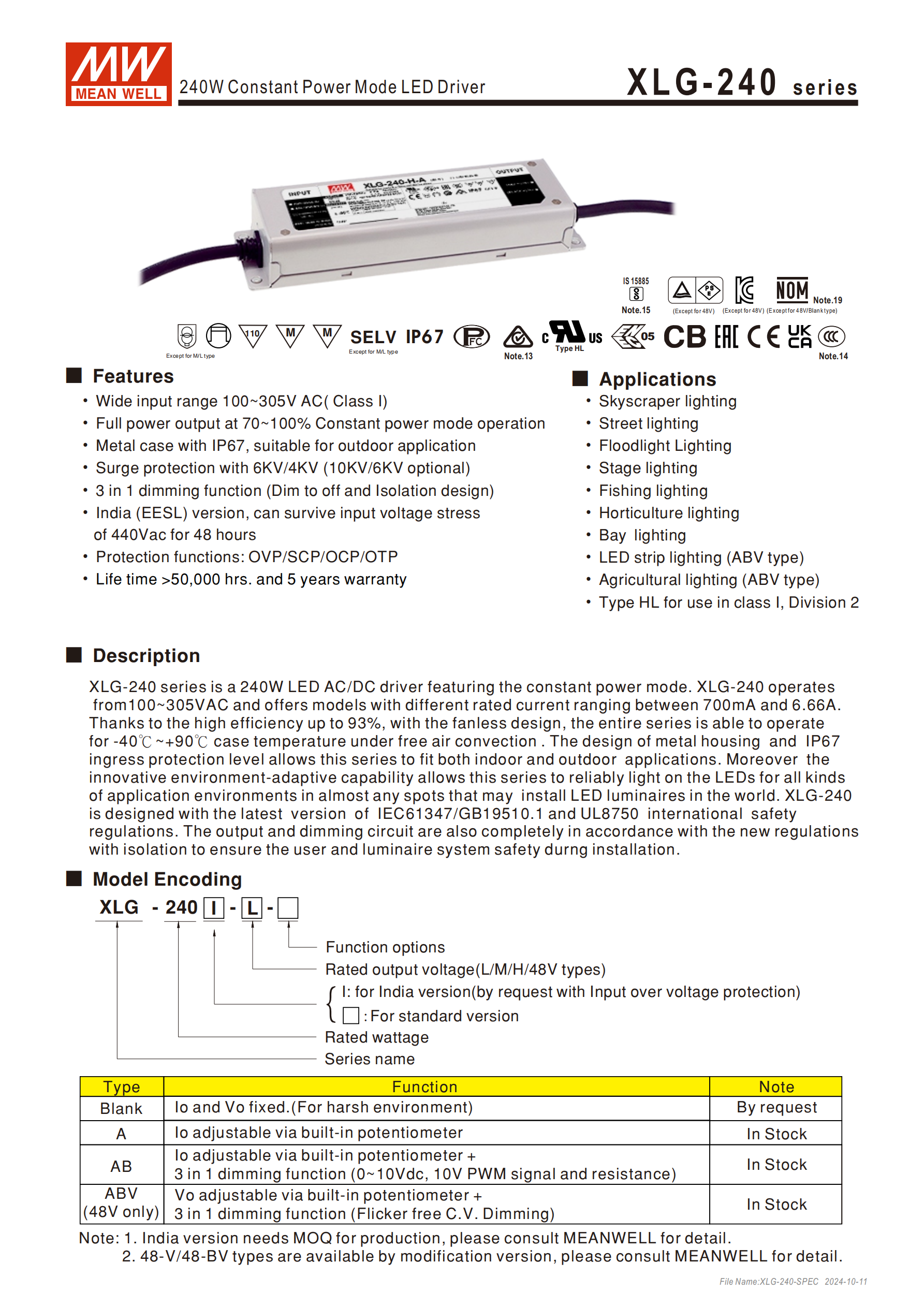 XLG-240 系列按功能模式和電壓版本劃分,電壓版本含 L/M/H/48V,印度版加后綴I(無 UL/CSA 認(rèn)證,有最小訂購量),48V 和 48-BV 為定制品;功能模式差異如下: