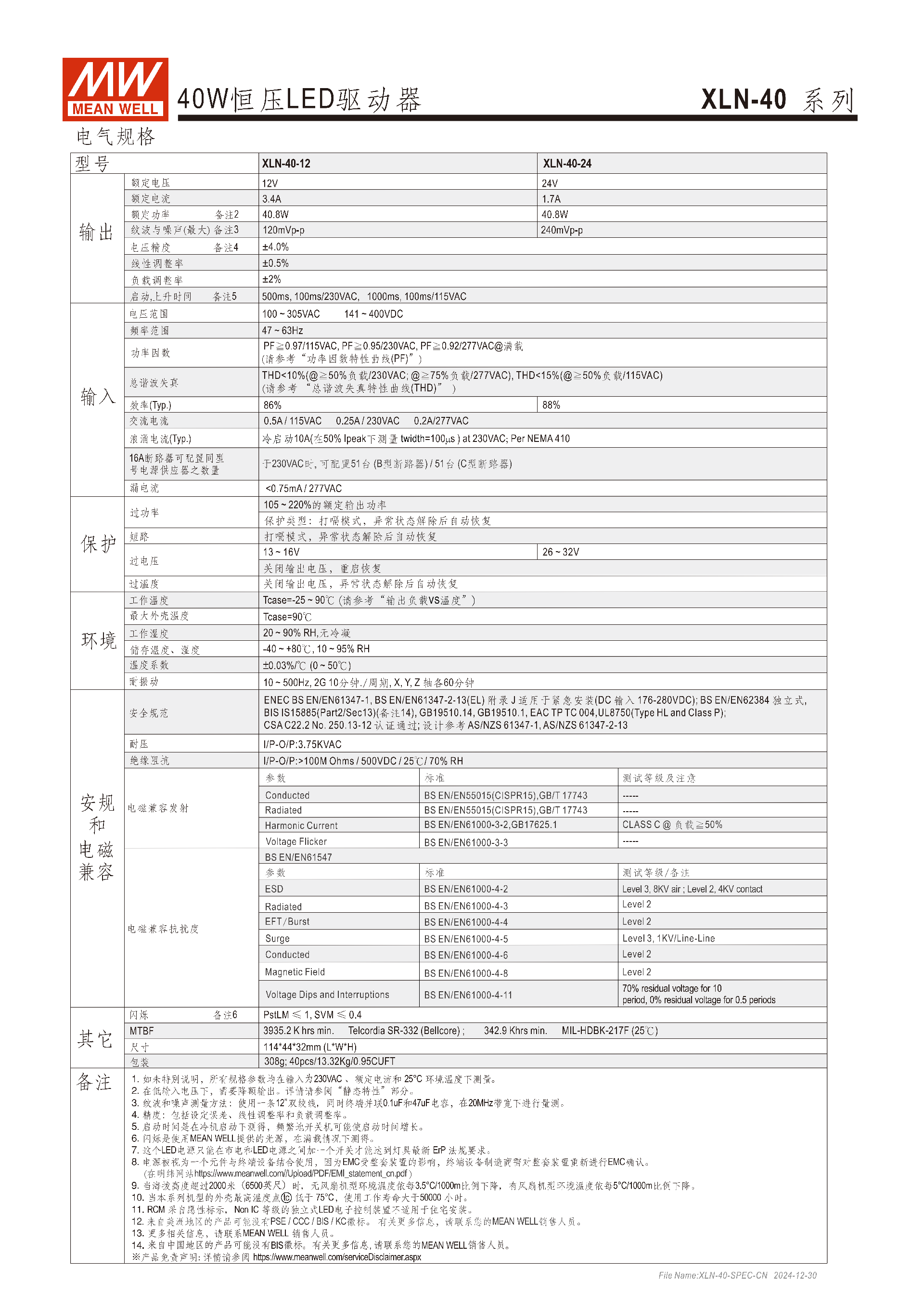 恒壓款XLN-40-2424V/1.7A40.8W240mVp-p±4.0%