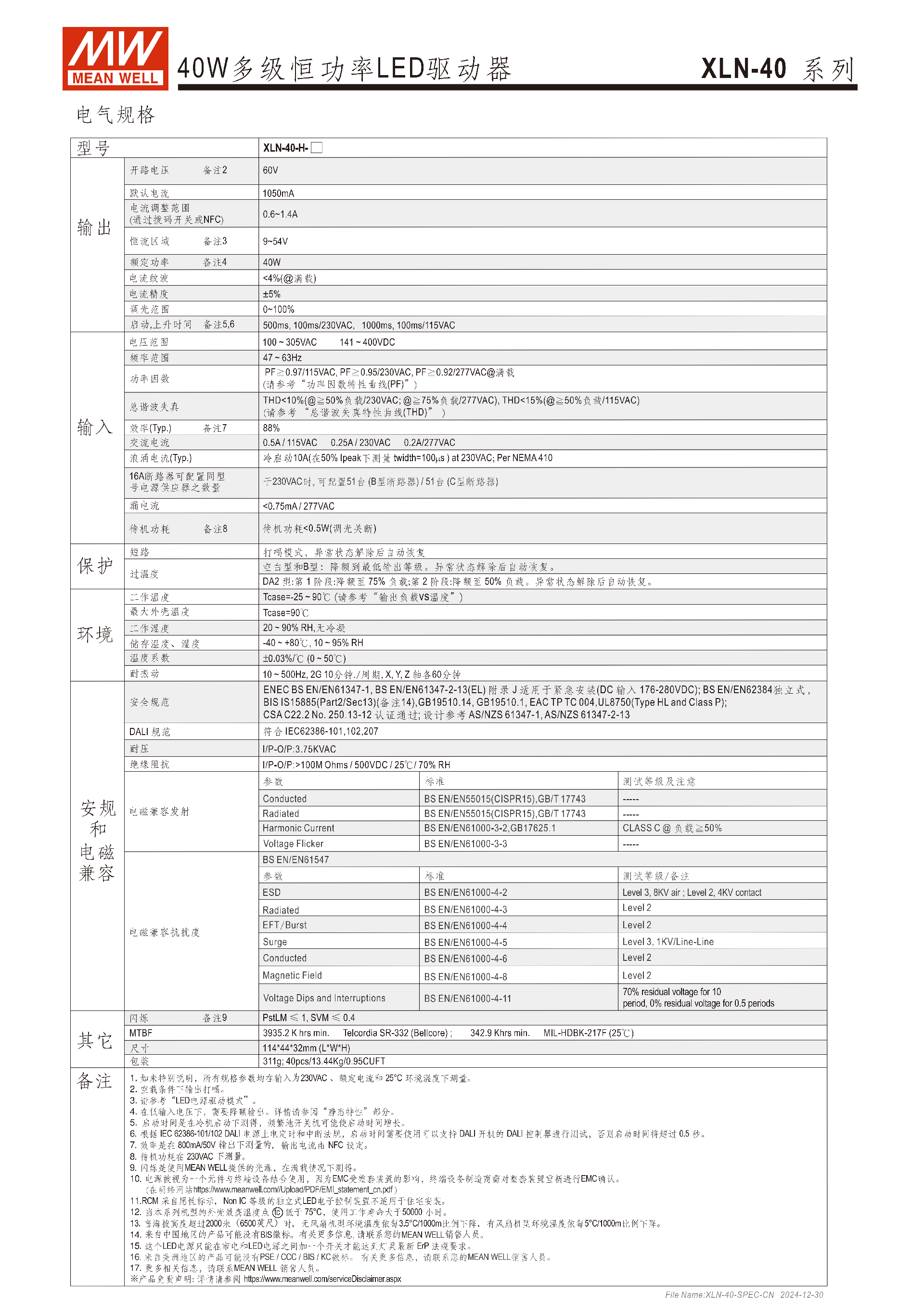 明緯XLN-40 系列是 40W 多級(jí)恒功率 / 恒壓 LED 驅(qū)動(dòng)器,具備IP67防塵防水等級(jí)、5 年保固,輸入電壓覆蓋100~305VAC/141~400VDC,H 型支持NFC設(shè)定輸出電流(600mA~1400mA),分 Blank/B/DA2 三款功能型號(hào),分別搭載基礎(chǔ)功能、三合一調(diào)光、DALI-2 DT6 調(diào)光(最小調(diào)光 0.1%),轉(zhuǎn)換效率最高88%,工作溫度 **-25℃~+90℃,符合 UL8750、CE ErP 等多項(xiàng)安規(guī),待機(jī)功耗<0.5W**,適配嵌燈、商業(yè)照明等多種 LED 照明場(chǎng)景,還滿足應(yīng)急照明應(yīng)用要求。