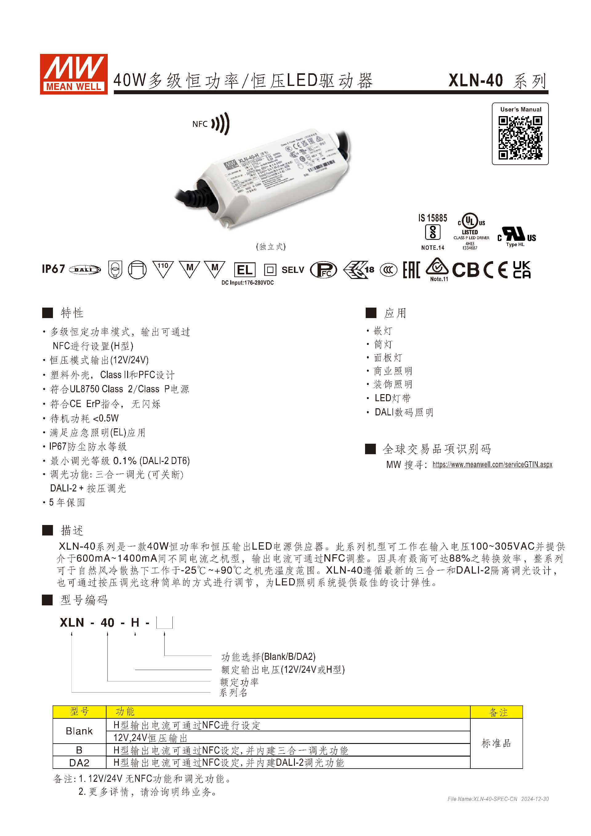 明緯XLN-40 系列是 40W 多級(jí)恒功率 / 恒壓 LED 驅(qū)動(dòng)器,具備IP67防塵防水等級(jí)、5 年保固,輸入電壓覆蓋100~305VAC/141~400VDC,H 型支持NFC設(shè)定輸出電流(600mA~1400mA),分 Blank/B/DA2 三款功能型號(hào),分別搭載基礎(chǔ)功能、三合一調(diào)光、DALI-2 DT6 調(diào)光(最小調(diào)光 0.1%),轉(zhuǎn)換效率最高88%,工作溫度 **-25℃~+90℃,符合 UL8750、CE ErP 等多項(xiàng)安規(guī),待機(jī)功耗<0.5W**,適配嵌燈、商業(yè)照明等多種 LED 照明場(chǎng)景,還滿足應(yīng)急照明應(yīng)用要求。