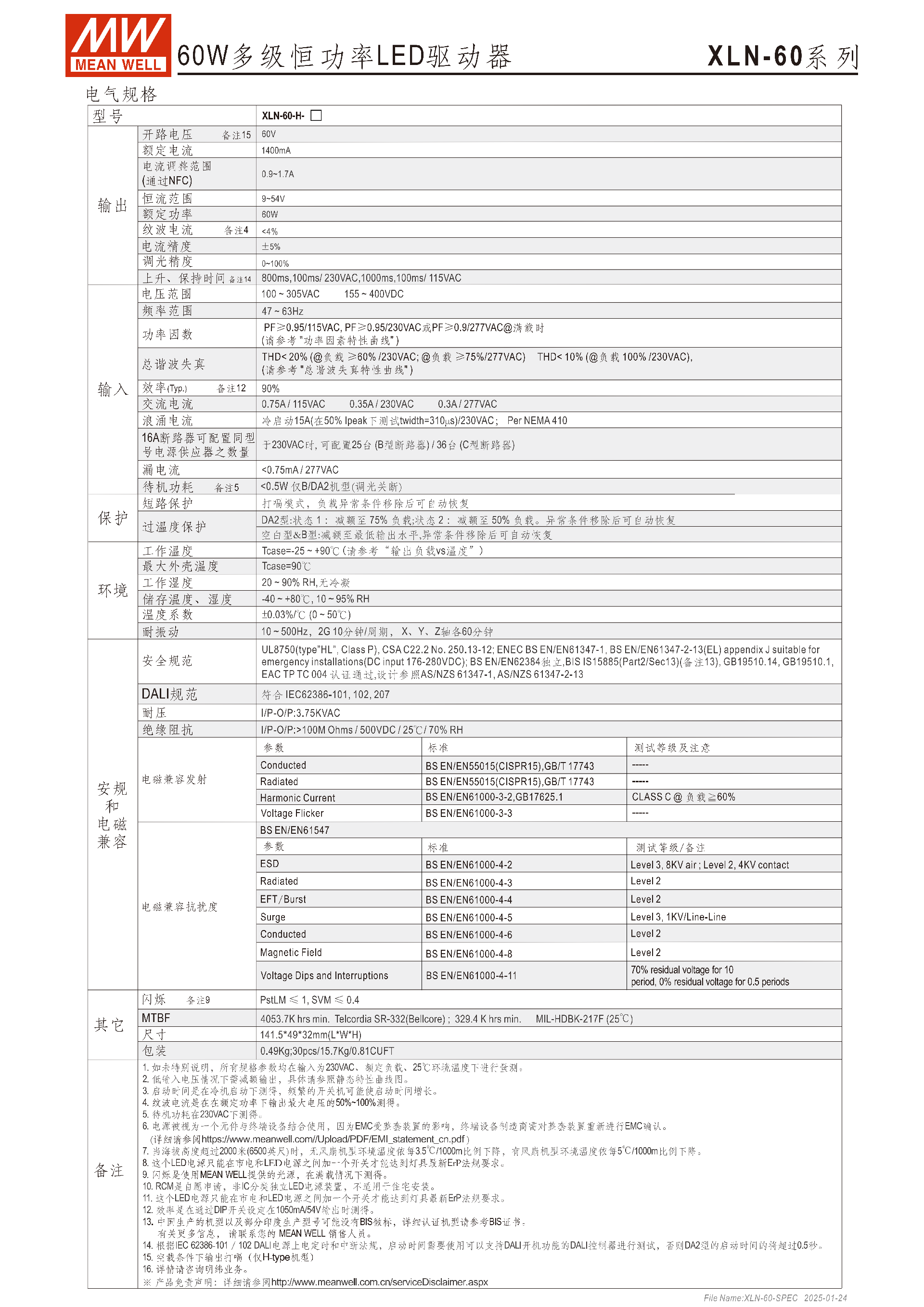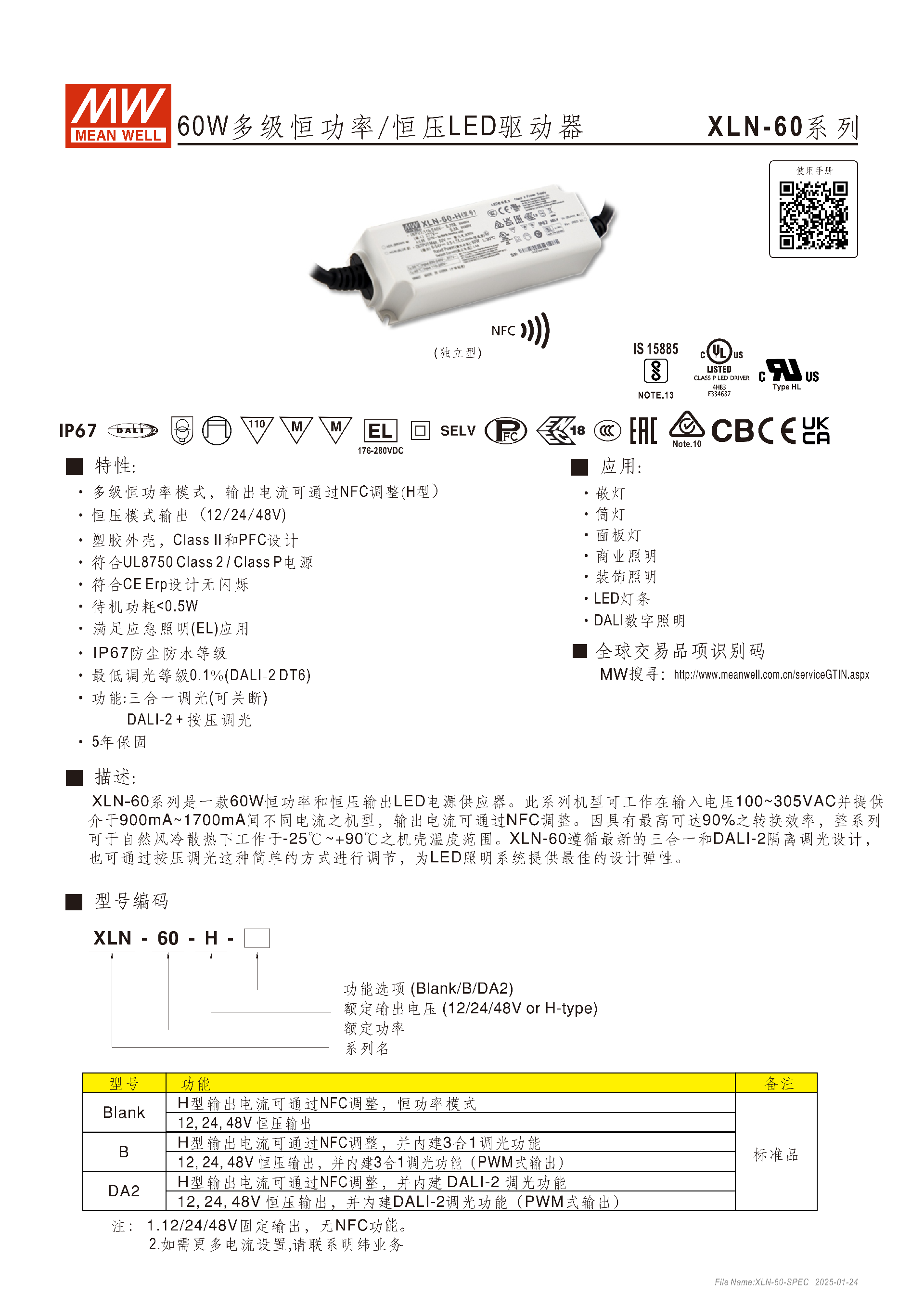 明緯XLN-60 系列是 60W 多級恒功率 / 恒壓 LED 驅(qū)動器,具備IP67防塵防水、Class Ⅱ和 PFC 設(shè)計,分恒壓(12/24/48V)和恒功率(H 型)兩類,H 型可通過NFC調(diào)整 0.9~1.7A 輸出電流,還分 Blank、B、DA2 三款功能機(jī)型,支持三合一調(diào)光、DALI-2 DT6 調(diào)光(最低 0.1%)、按壓調(diào)光,輸入電壓覆蓋100~305VAC/155~400VDC,工作溫度 **-25~+90℃,轉(zhuǎn)換效率最高90%,待機(jī)功耗<0.5W**,擁有完善的保護(hù)功能和多項國際認(rèn)證,提供5 年保固,適用于嵌燈、商業(yè)照明等多種 LED 照明場景。