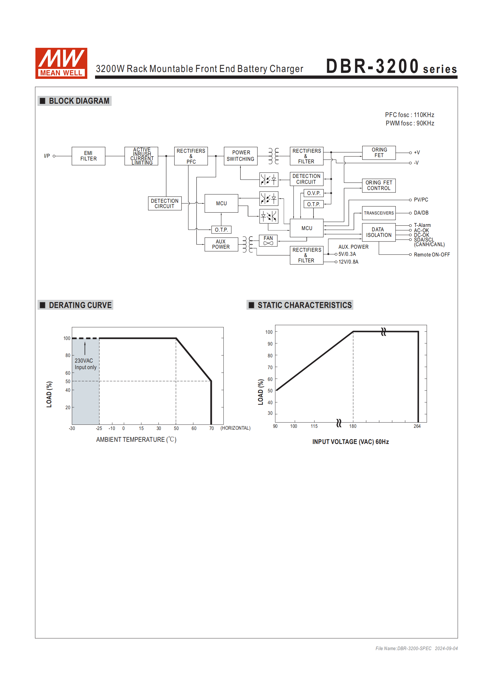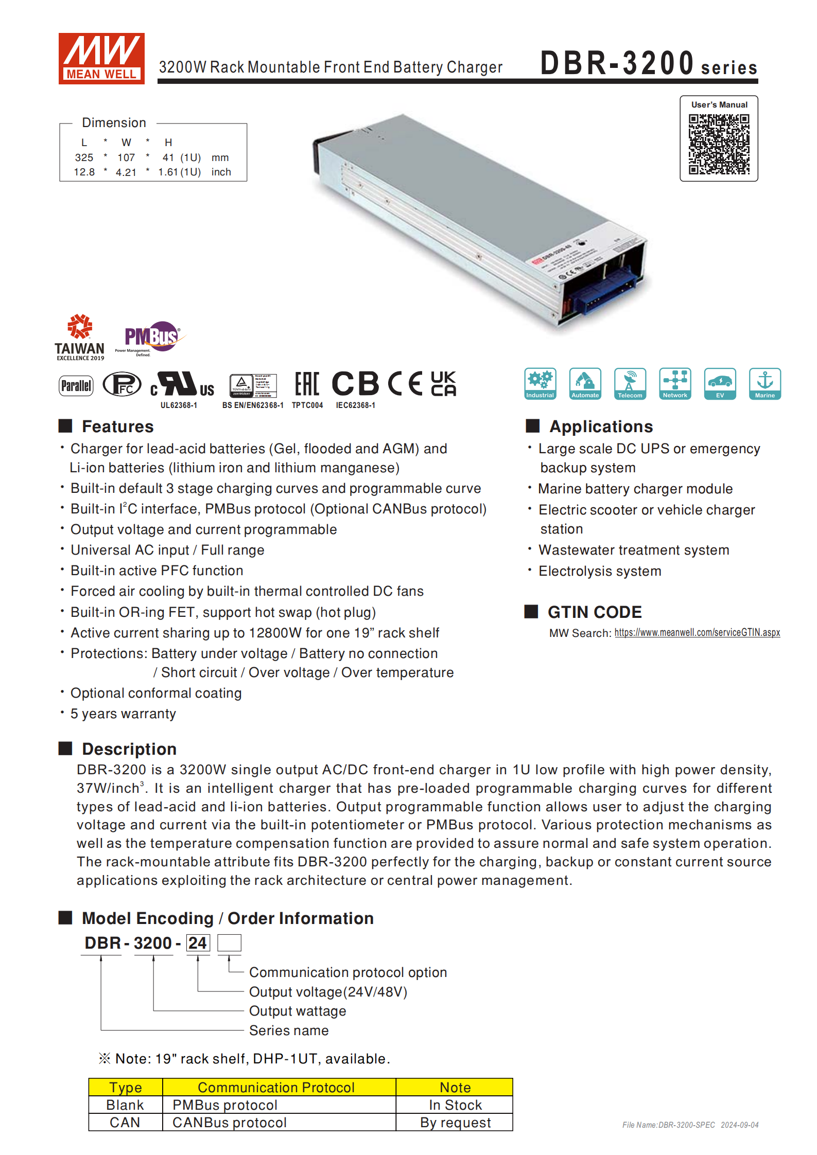 DBR-3200 系列是明緯推出的3200W機(jī)架安裝前置式電池充電器,擁有1U低外型與37W/inch高功率密度,支持24V/48V兩種輸出規(guī)格,可適配鉛酸(加水、膠體、AGM)和鋰電池(鋰鐵、鋰猛),內(nèi)置三段式可編程充電曲線,具備PMBus/CANBus可選通訊協(xié)議,交流輸入為90~264VAC/127~370VDC全范圍,輸出電壓、電流可分別在75~125% 額定值、20~100% 額定值間調(diào)節(jié),搭載主動(dòng)式 PFC、OR-ing FET 熱插拔、多重保護(hù)及溫度補(bǔ)償功能,主動(dòng)式并聯(lián)可達(dá)12800W,適配機(jī)架式 / 集中式充電場(chǎng)景,提供5 年保固,安規(guī)符合 UL62368-1 等國際標(biāo)準(zhǔn)。