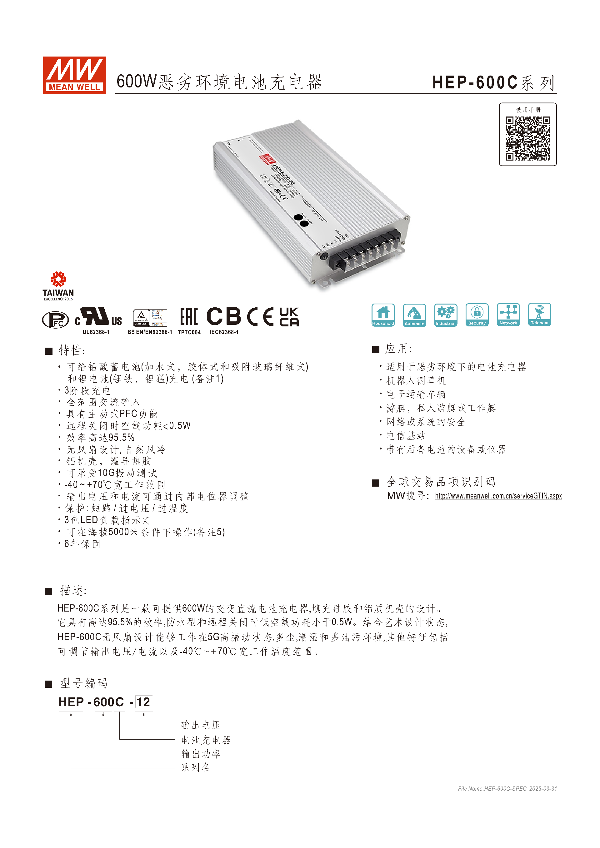 HEP-600C 系列是明緯推出的600W 惡劣環(huán)境電池充電器,擁有鋁機殼灌導熱膠的無風扇自然風冷設計,支持 **-40~+70℃寬工作溫度、5000 米海拔操作及 10G 振動耐受,具備95.5%最高轉換效率,遠程關閉時空載功耗<0.5W且?guī)е鲃邮?PFC 功能;該系列分12/24/48V三款型號,支持鉛酸和鋰電池充電,采用3 階段充電模式,輸出電壓 / 電流可通過內(nèi)部電位器調(diào)節(jié),配備短路 / 過壓 / 過溫三重保護與 3 色 LED 指示燈,擁有6 年保固 **,適用于機器人割草機、游艇、電信基站等惡劣環(huán)境場景,同時通過 UL62368-1 等多項安規(guī)認證,MTBF 最低達 73.1K hrs(MIL-HDBK-217F 標準)。