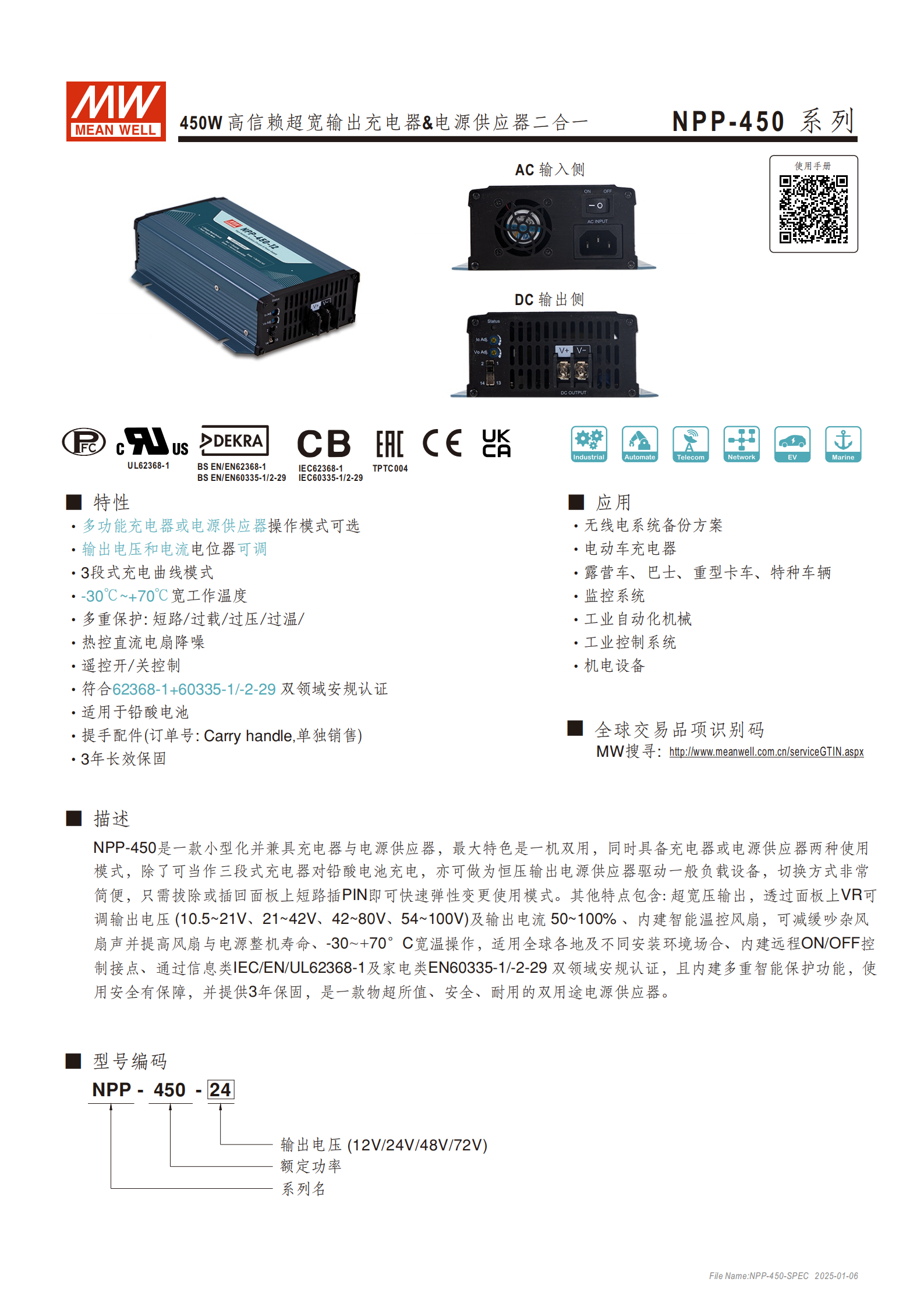 產(chǎn)品定位:NPP-450 系列為 450W 高可靠性超寬輸出范圍的電池充電器 + 電源二合一設(shè)備,小型化設(shè)計(jì),兼具智能、安全、高性價(jià)比特點(diǎn),專屬適配鉛酸電池(富液式、膠體、AGM)。