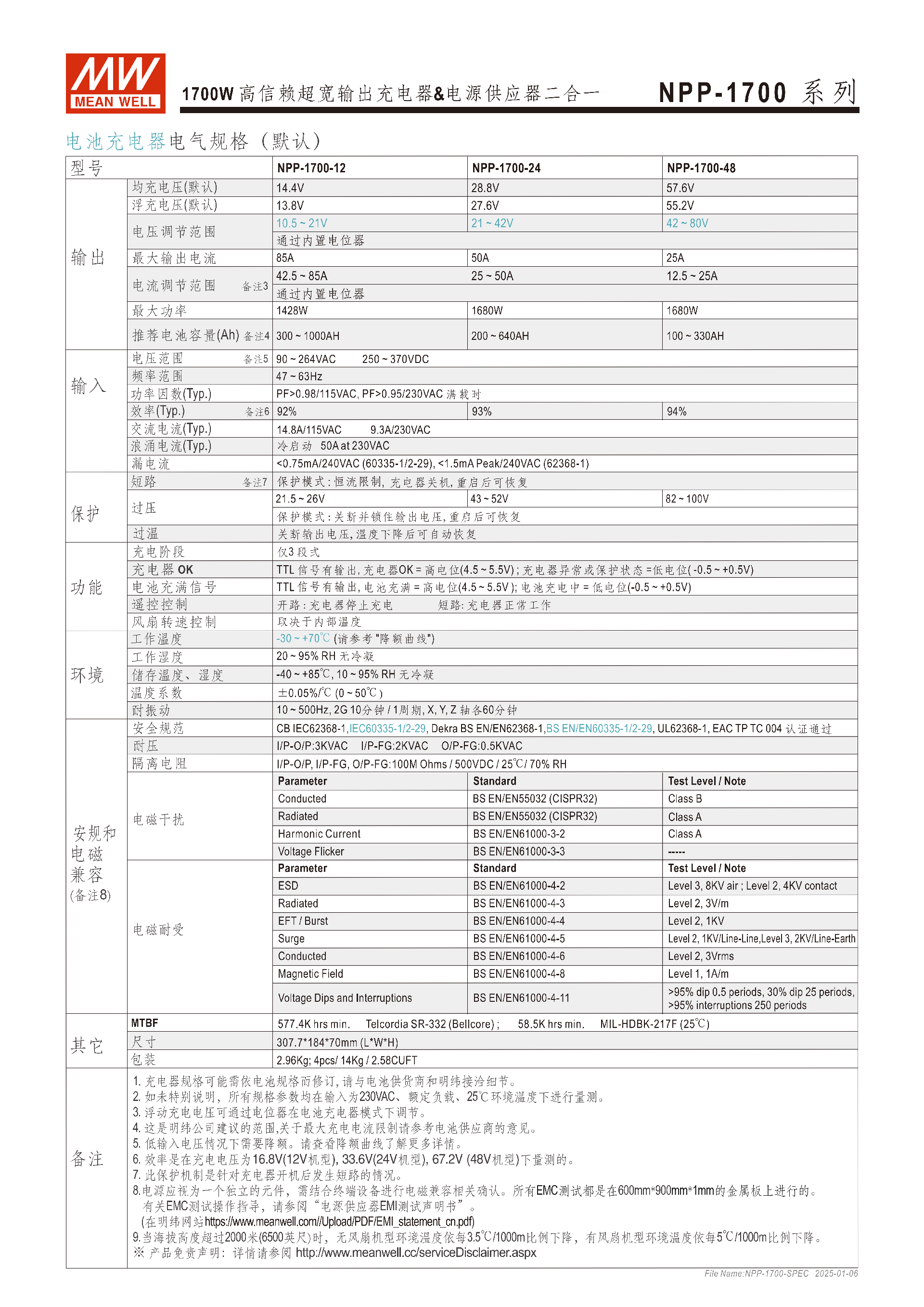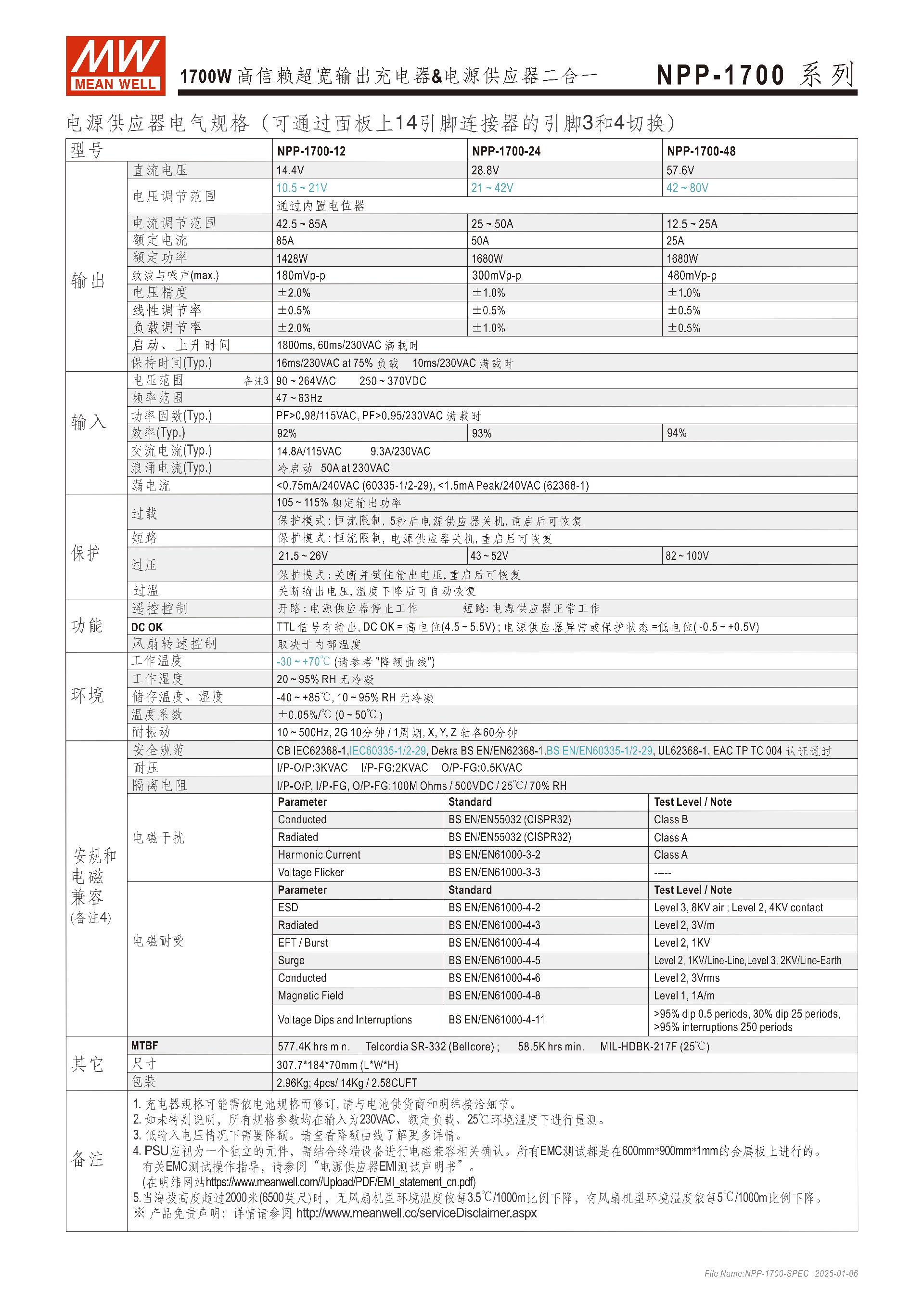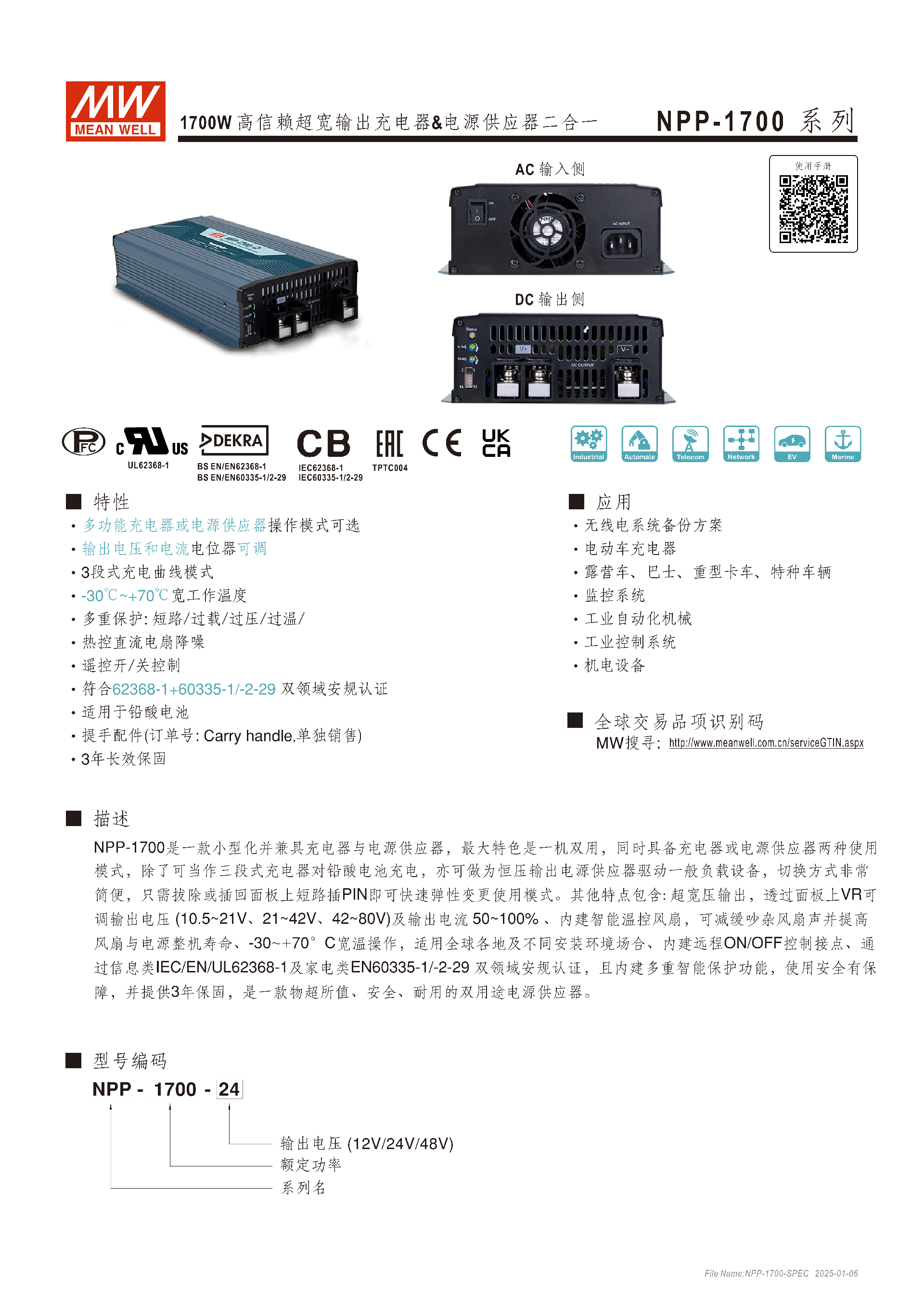 NPP-1700 系列是明緯推出的1700W充電器與電源供應器二合一設備,主打一機雙用,可通過面板短路插 PIN3/4 快速切換模式,支持12V/24V/48V三種輸出電壓規(guī)格,具備三段式充電曲線適配鉛酸電池,輸出電壓和電流可通過電位器調(diào)節(jié),擁有 **-30℃~+70℃寬工作溫度,內(nèi)建多重智能保護、溫控風扇及遙控開關功能,通過IEC62368-1+IEC60335-1/2-29雙領域安規(guī)認證,MTBF 達577.4K hrs**(Telcordia SR-332),提供3 年保固,適用于無線電備份、電動車充電、工業(yè)自動化等多場景,機身尺寸307.718470mm,重 2.96Kg。