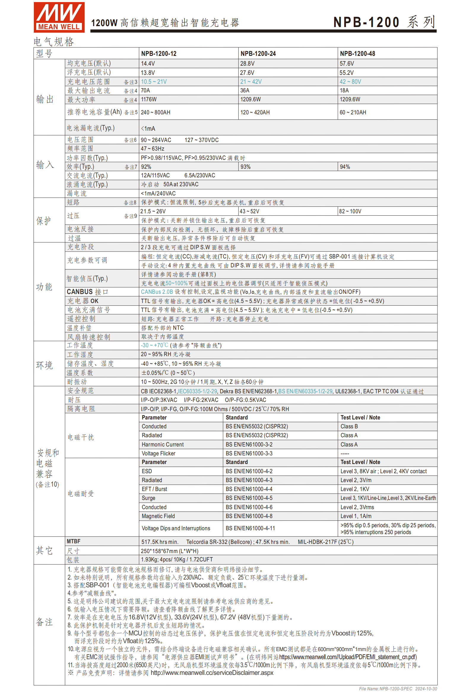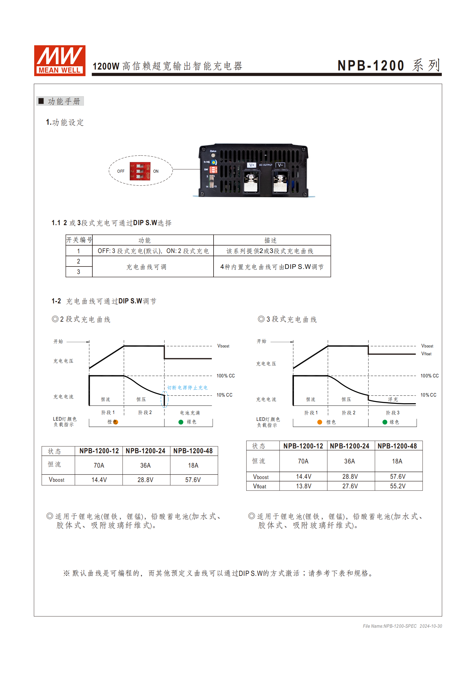 機型劃分:按輸出電壓分NPB-1200-12/24/48三款,對應(yīng)超寬充電電壓范圍 10.5~21V、21~42V、42~80V;
