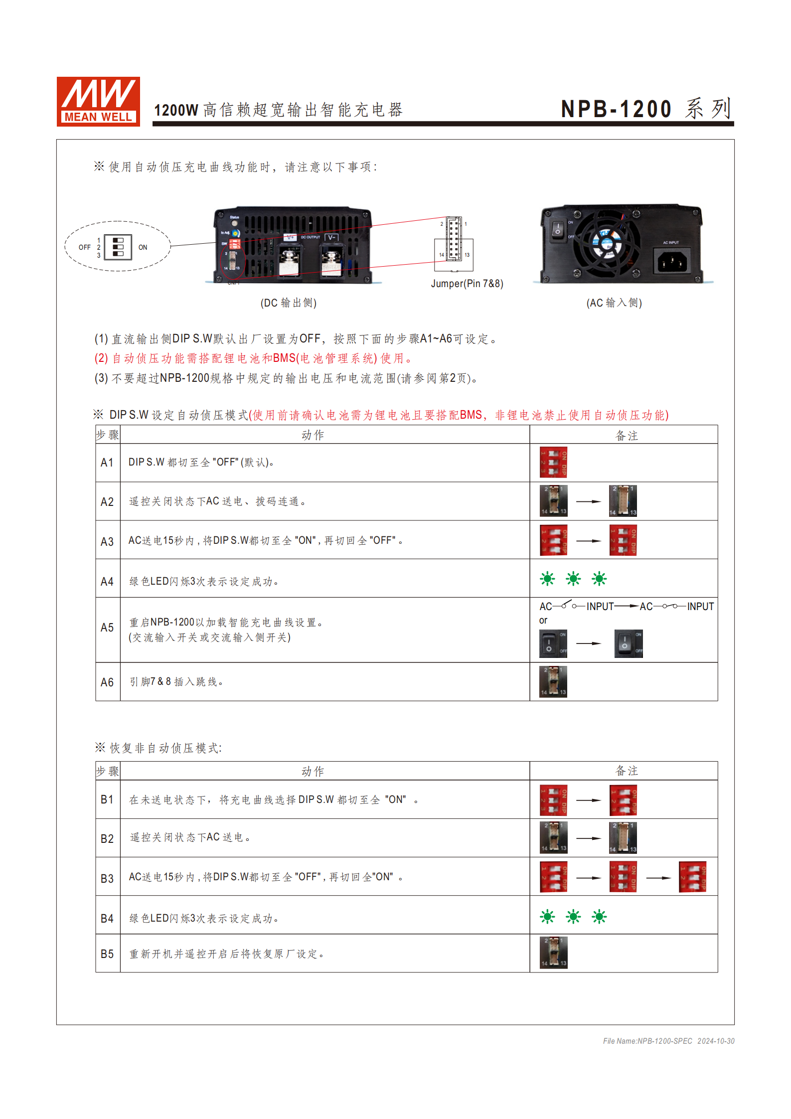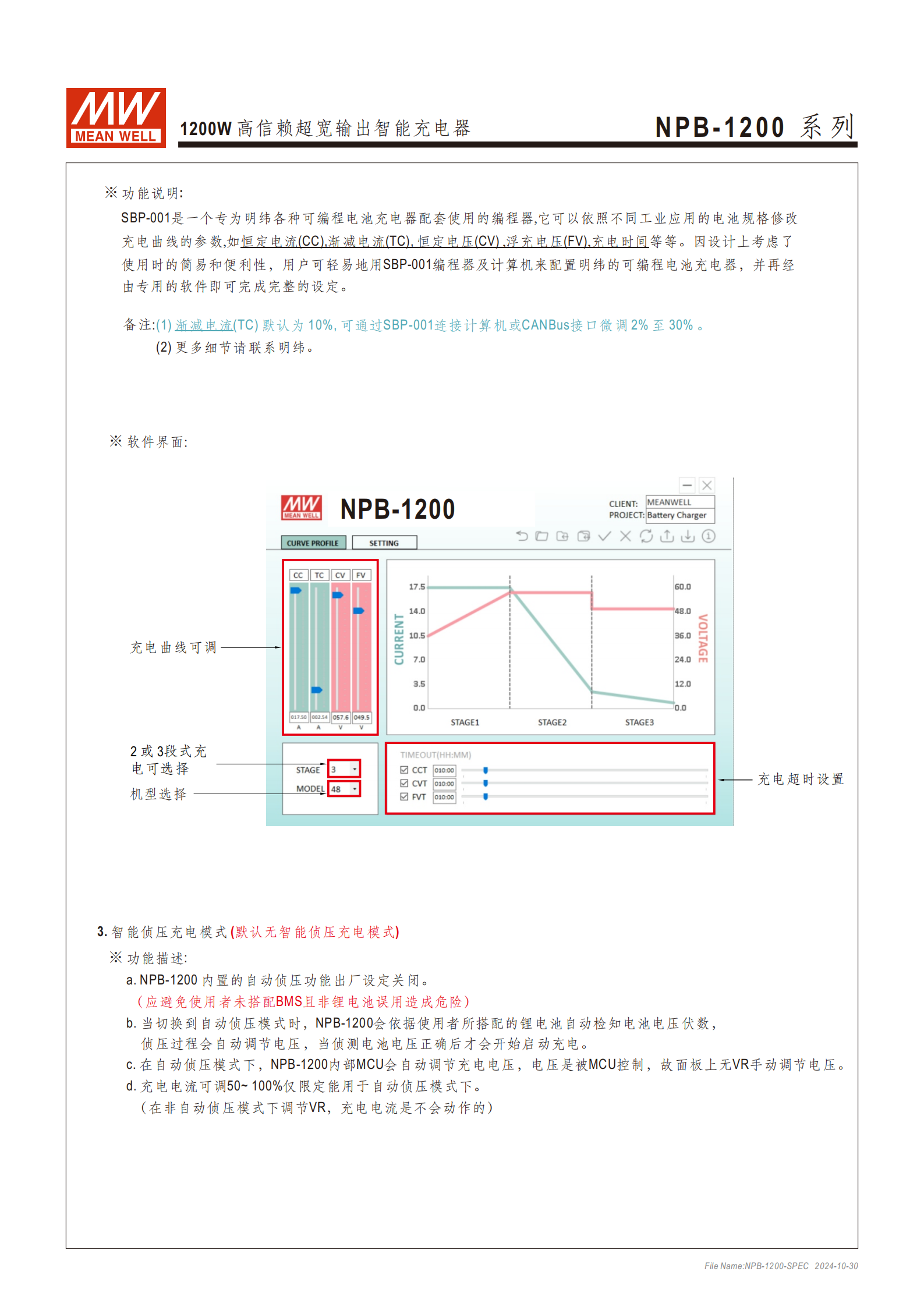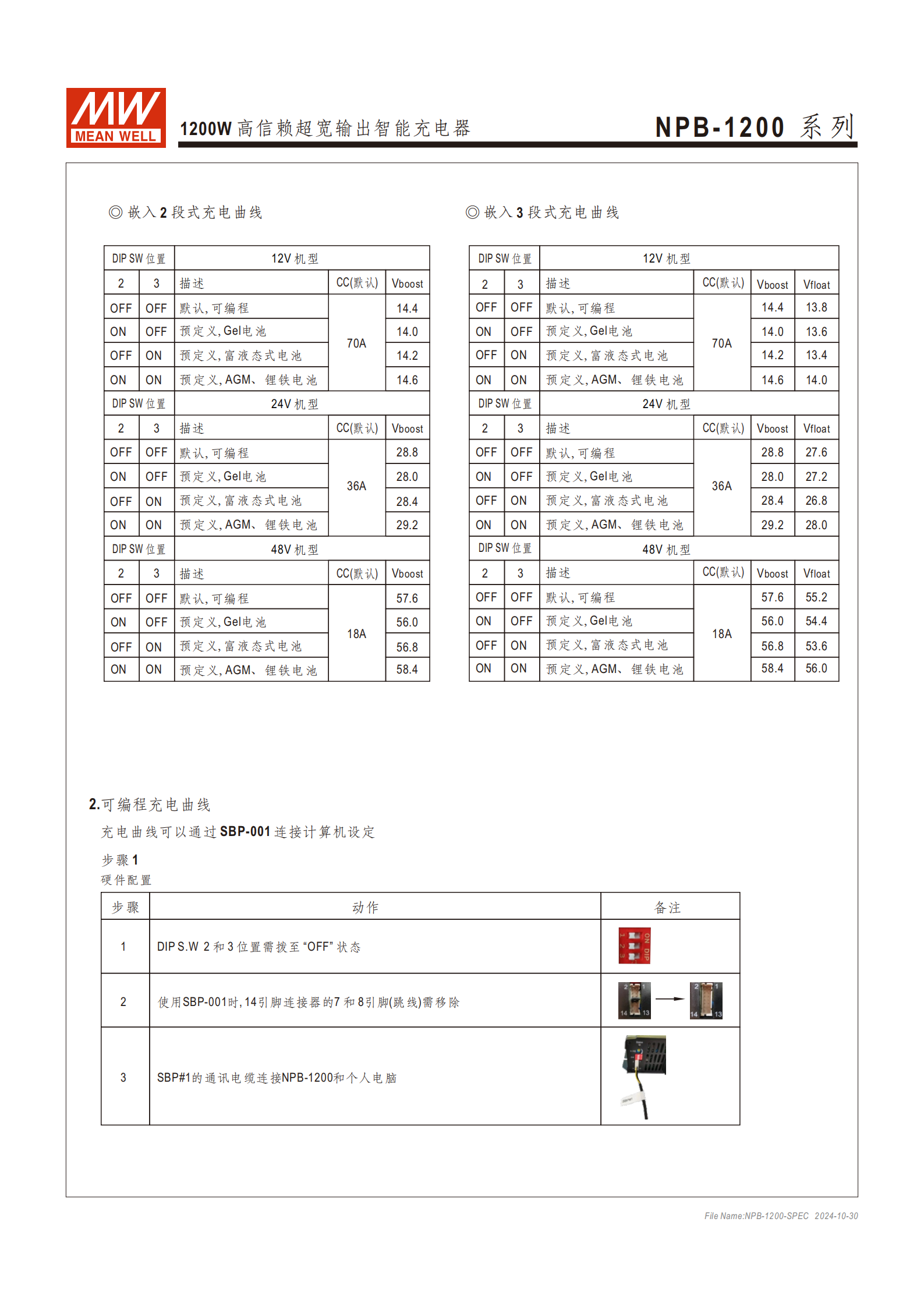 機(jī)型劃分:按輸出電壓分NPB-1200-12/24/48三款,對(duì)應(yīng)超寬充電電壓范圍 10.5~21V、21~42V、42~80V;