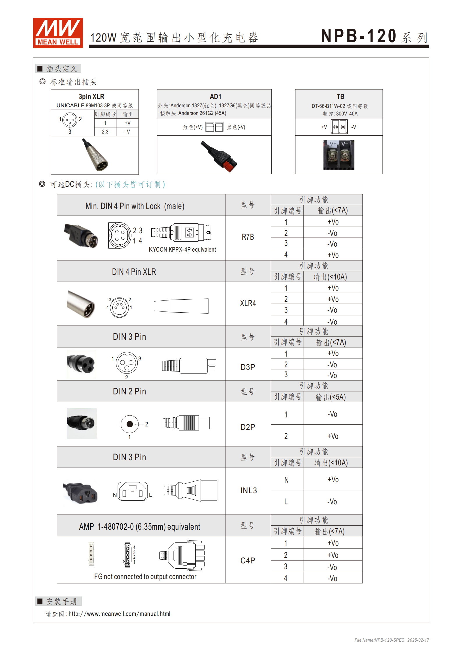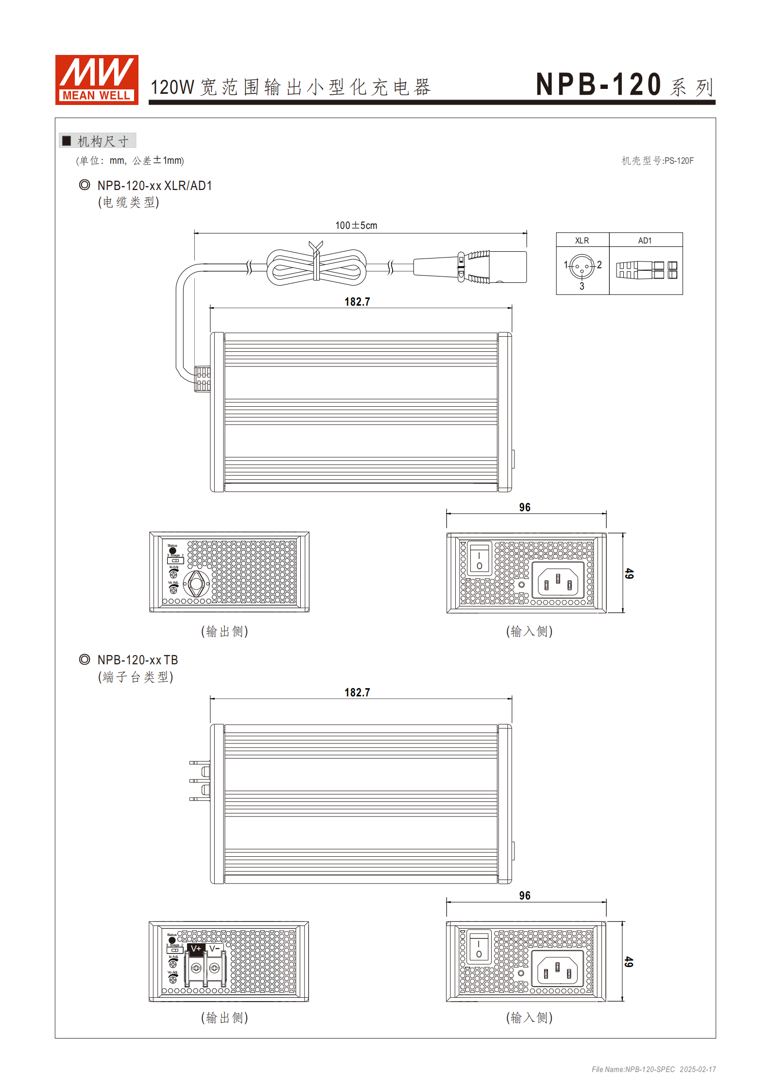 NPB-120 系列是明緯推出的120W 寬范圍輸出小型化充電器,支持90~264VAC 通用交流輸入,具備無(wú)風(fēng)扇設(shè)計(jì)和3 年保固,可適配鉛酸電池(加水 / 膠體 / 吸附玻璃纖維式)與鋰電池(鋰鐵 / 鋰錳),分12V/24V/48V三款核心機(jī)型,輸出電壓、電流均可調(diào),提供XLR/AD1/TB三種輸出插頭類型,擁有短路 / 過(guò)壓 / 過(guò)溫 / 電池反極性四重保護(hù),工作溫度寬達(dá) **-30~+70℃,通過(guò)UL/EN62368-1等雙安規(guī)及多項(xiàng)電磁兼容認(rèn)證,適用于無(wú)線電系統(tǒng)備份、電動(dòng)車、特種車輛等多場(chǎng)景,還可通過(guò) DIP 開(kāi)關(guān)選擇2/3 段式充電曲線 **,分別匹配鋰電池和鉛酸電池。