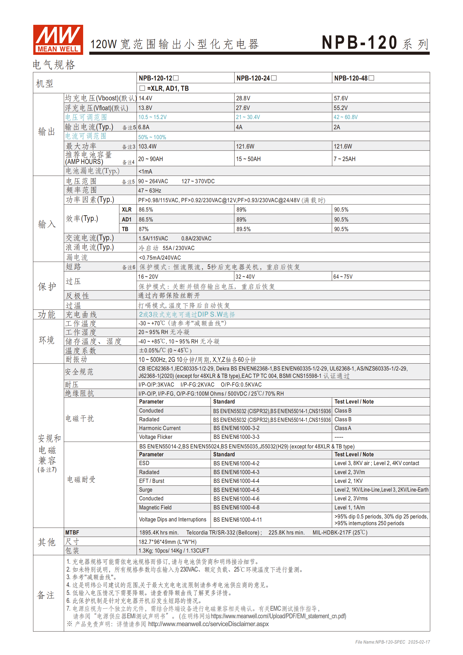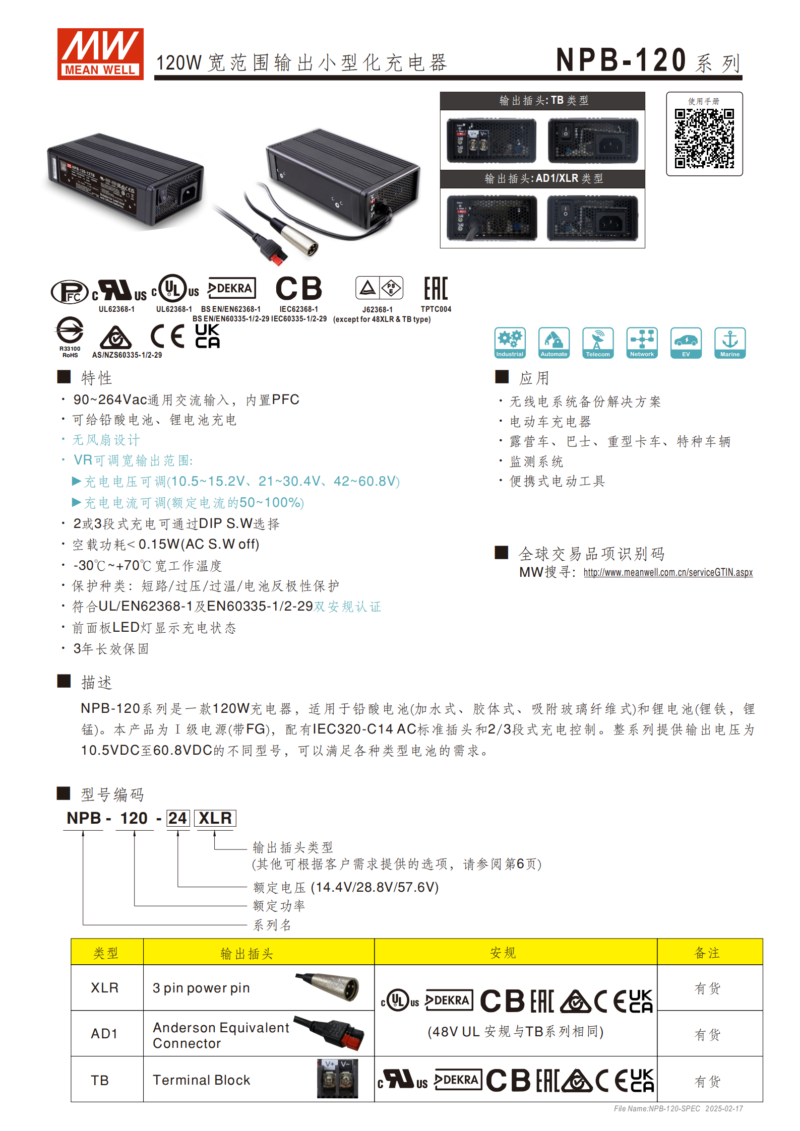 NPB-120 系列為明緯研發(fā)的120W 寬范圍輸出小型化充電器,屬于 Ⅰ 級電源(帶 FG),內(nèi)置 PFC,無風(fēng)扇設(shè)計,空載功耗 **<0.15W**,提供3 年長效保固,是全球交易品項,可適配鉛酸電池(加水式、膠體式、吸附玻璃纖維式)和鋰電池(鋰鐵、鋰錳),通過UL/EN62368-1雙安規(guī)認(rèn)證,適用于無線電系統(tǒng)備份、電動車、露營車 / 重型卡車 / 特種車輛、監(jiān)測系統(tǒng)、便攜式電動工具等場景。