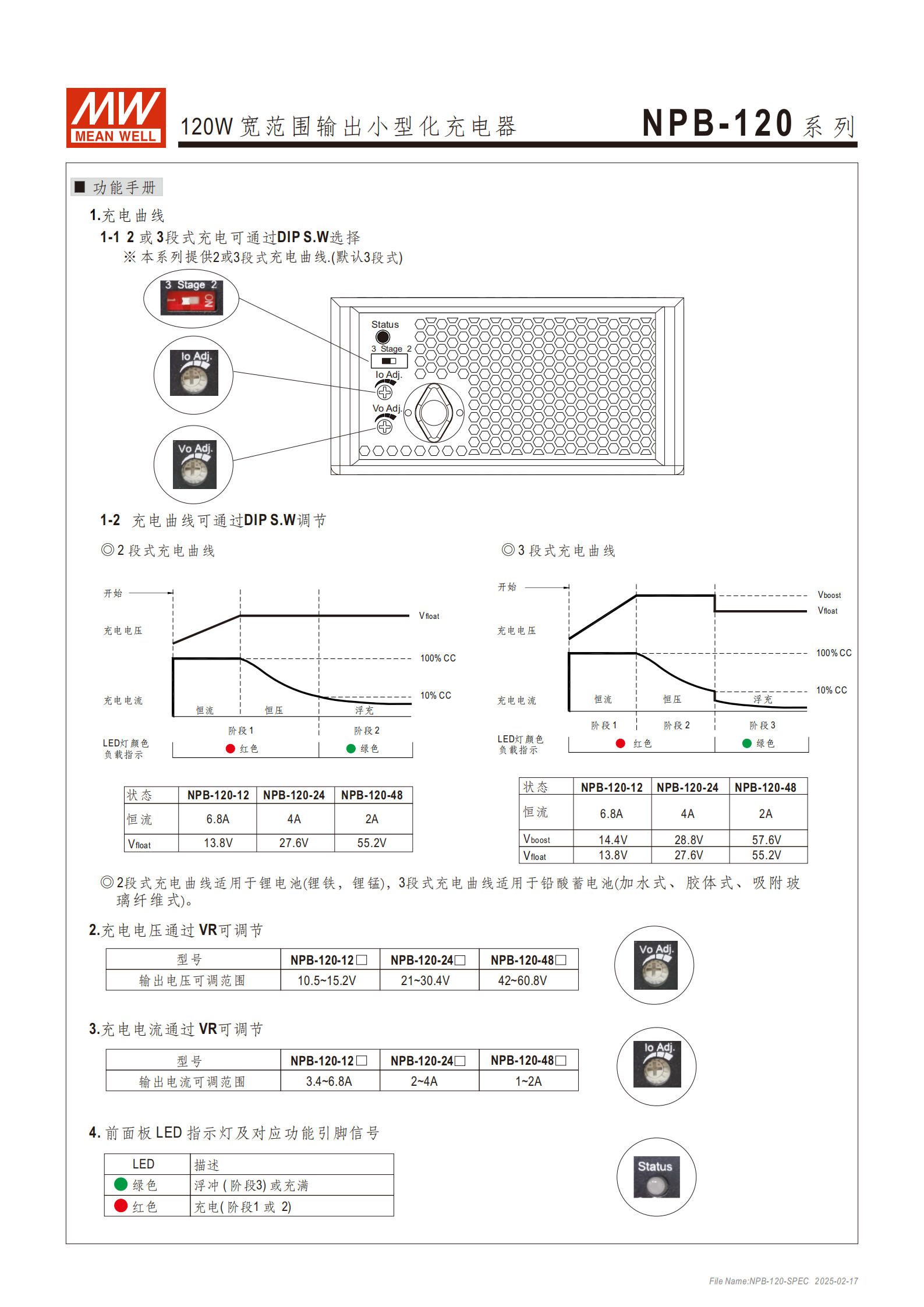 狀態(tài)顯示:前面板 LED 燈,紅色為充電階段(1/2 段),綠色為浮充 / 充滿階段(3 段)