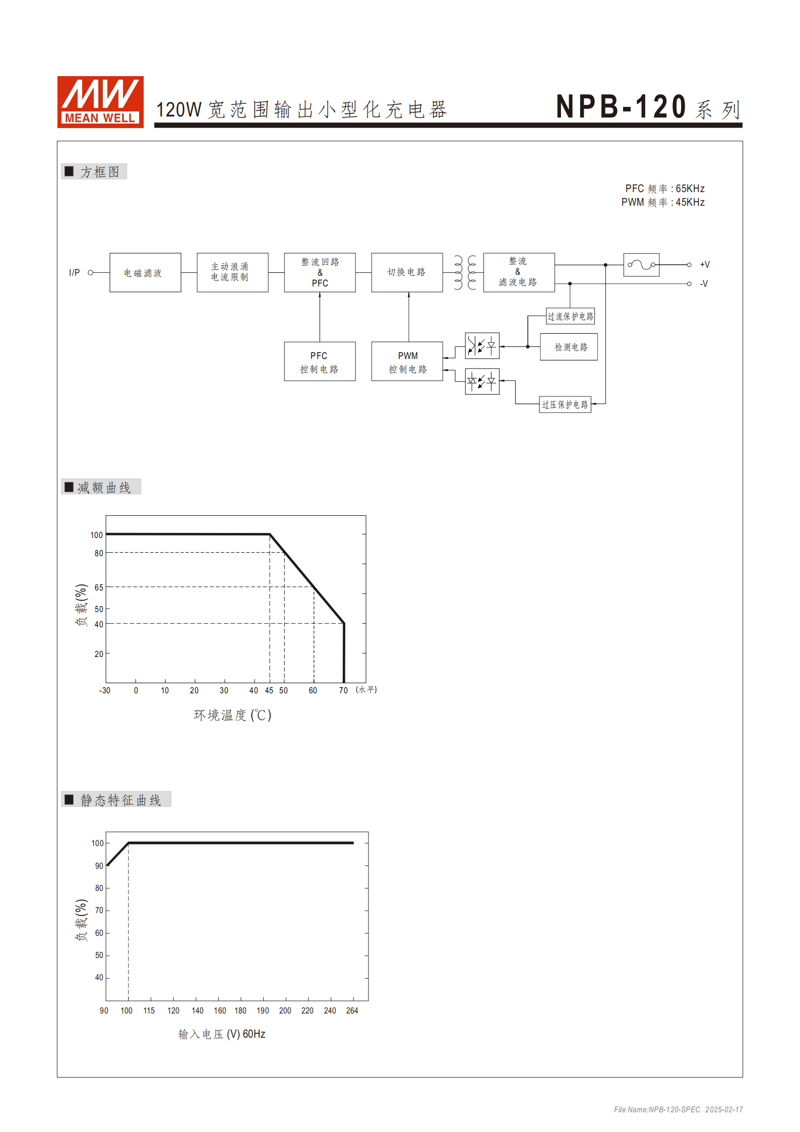 明緯 NPB-240 系列 240W 寬范圍輸出小型化充電器支持90~264VAC通用交流輸入,為 Ⅰ 級(jí)電源且無風(fēng)扇設(shè)計(jì),擁有XLR、AD1、TB三種主流輸出插頭類型,分12/24/48V三款核心機(jī)型,輸出電壓 / 電流可分別通過 VR 調(diào)節(jié)(電壓范圍 10.5~15.2V/21~30.4V/42~60.8V、電流為額定的 50%~100%),支持通過 DIP S.W 選擇2/3 段式充電曲線(2 段適配鋰電池、3 段適配鉛酸電池),具備短路 / 過壓 / 過溫 / 電池反極性多重保護(hù),工作溫度寬達(dá) **-30~+70℃,通過雙安規(guī)認(rèn)證且提供3 年保固 **,適用于鉛酸 / 鋰電池充電、電動(dòng)車、特種車輛、無線電系統(tǒng)備份等多場(chǎng)景。
