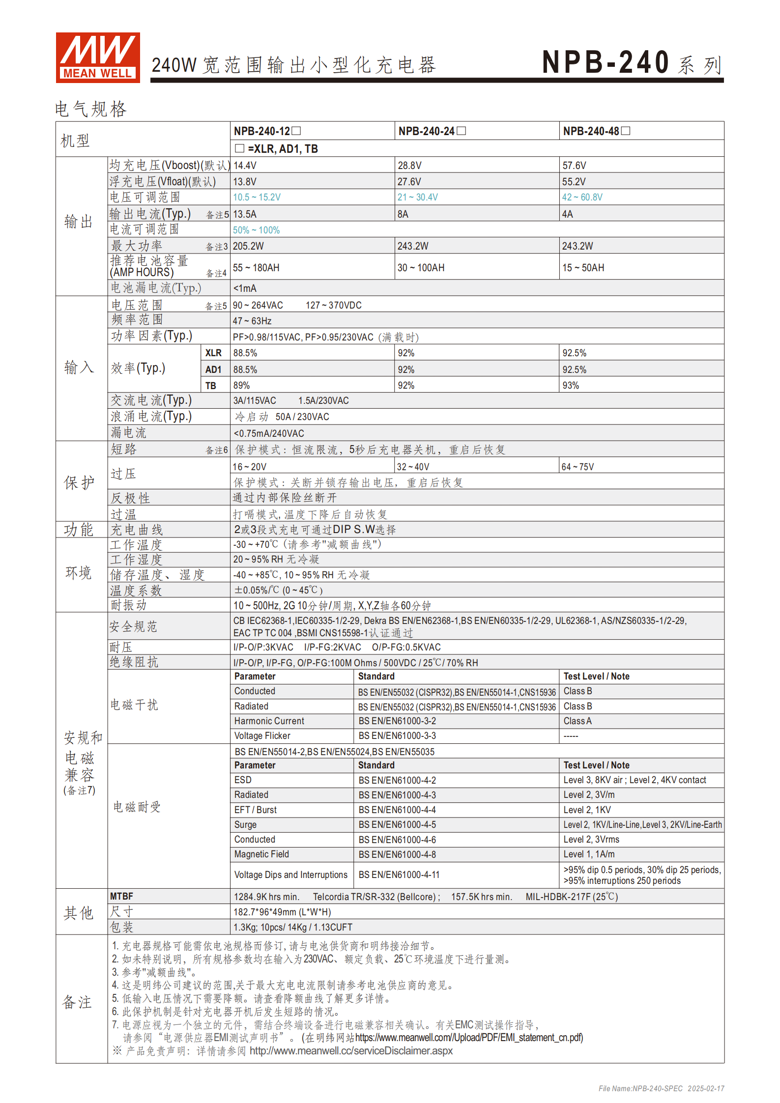 明緯 NPB-240 系列 240W 寬范圍輸出小型化充電器支持90~264VAC通用交流輸入,為 Ⅰ 級電源且無風扇設計,擁有XLR、AD1、TB三種主流輸出插頭類型,分12/24/48V三款核心機型,輸出電壓 / 電流可分別通過 VR 調(diào)節(jié)(電壓范圍 10.5~15.2V/21~30.4V/42~60.8V、電流為額定的 50%~100%),支持通過 DIP S.W 選擇2/3 段式充電曲線(2 段適配鋰電池、3 段適配鉛酸電池),具備短路 / 過壓 / 過溫 / 電池反極性多重保護,工作溫度寬達 **-30~+70℃,通過雙安規(guī)認證且提供3 年保固 **,適用于鉛酸 / 鋰電池充電、電動車、特種車輛、無線電系統(tǒng)備份等多場景。
