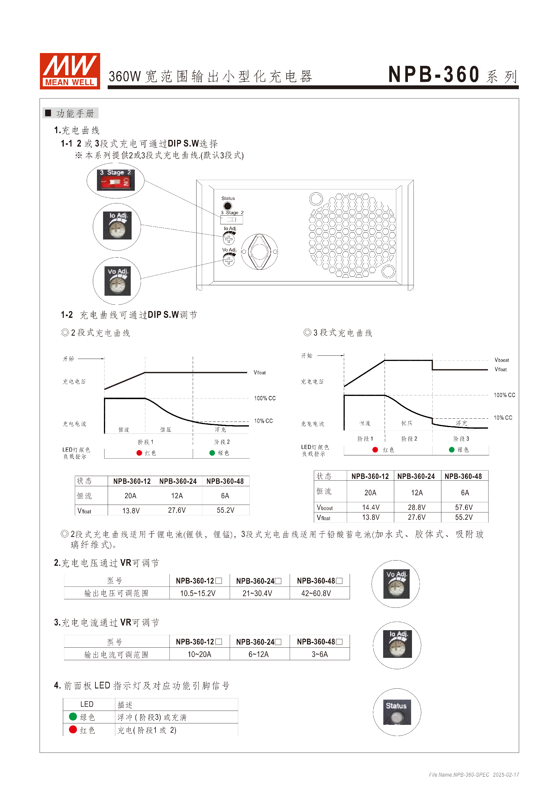 明緯 NPB-360 系列是 360W 寬范圍輸出小型化充電器,支持90~264VAC通用交流輸入,內(nèi)置 PFC,適配鉛酸電池和鋰電池,分12/24/48V三款核心機(jī)型,輸出插頭有 XLR、AD1、TB 三種類型且均有貨;具備電壓(10.5~60.8V)、電流(額定 50%~100%)可調(diào)特性,可通過 DIP 開關(guān)選擇 2/3 段式充電曲線(2 段適配鋰電、3 段適配鉛酸),擁有短路 / 過壓 / 過溫 / 電池反極性四重保護(hù),工作溫度寬至 **-30~+70℃,通過 UL/EN 等多國雙安規(guī)認(rèn)證,提供3 年保固 **,還具備空載功耗 < 0.15W、風(fēng)扇溫控、前面板 LED 狀態(tài)顯示等功能,廣泛應(yīng)用于無線電備份、電動車、特種車輛等場景。