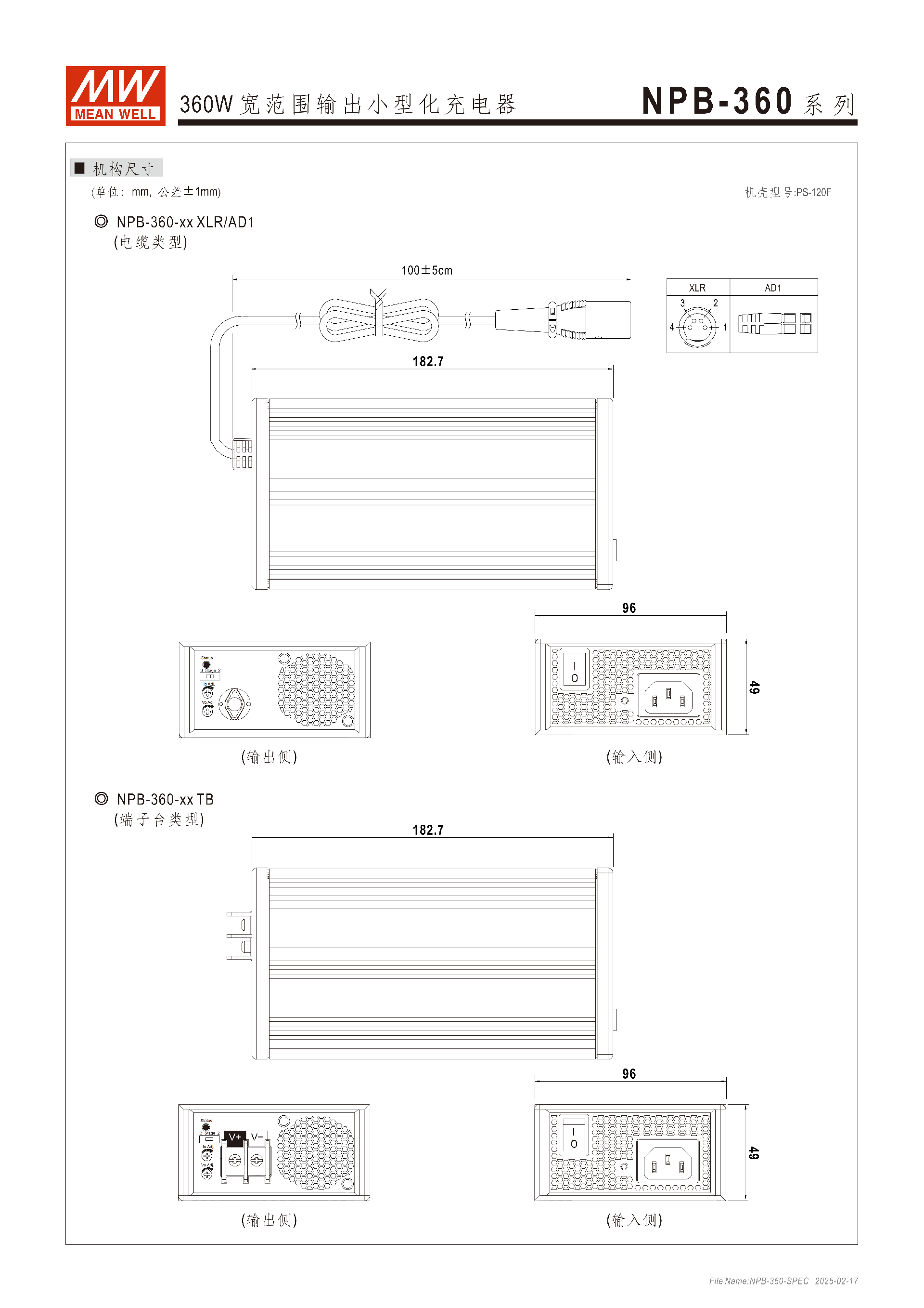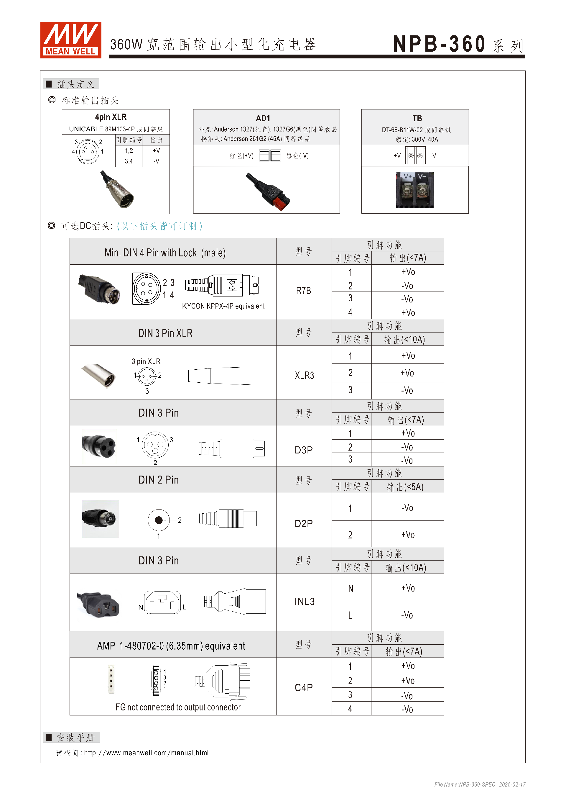 額定電壓-NPB-360-輸出插頭類型(如 24-NPB-360-XLR),額定電壓分 14.4V/28.8V/57.6V,對應(yīng) 12/24/48V 機(jī)型輸出插頭類型(均有貨,可訂制其他類型):| 類型 | 輸出插頭規(guī)格 | 安規(guī)備注 || ---- | ------------ | -------- || XLR | 4 pin power pin | - || AD1 | Anderson Equivalent Connector | 48V UL 認(rèn)證與 TB 類型相同 || TB | Terminal Block | - |