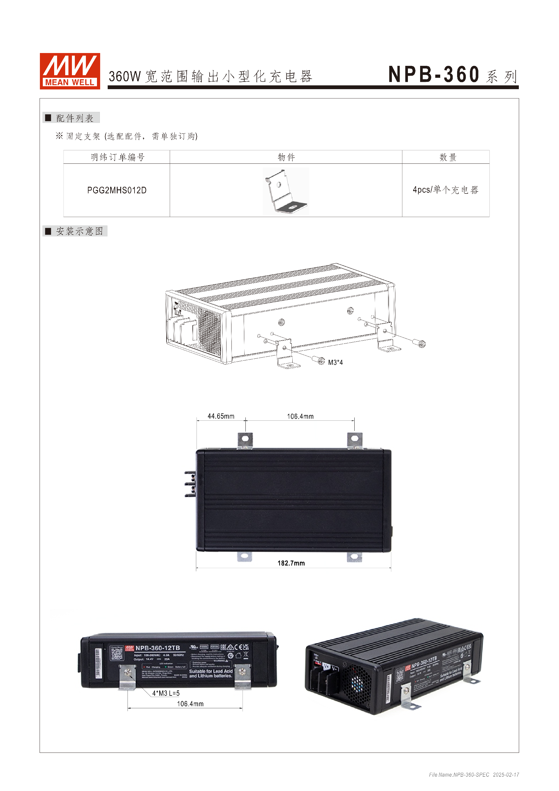 選配配件:固定支架(明緯訂單編號 PGG2MHS012D),4pcs / 個充電器,安裝用 M34/M35 螺絲