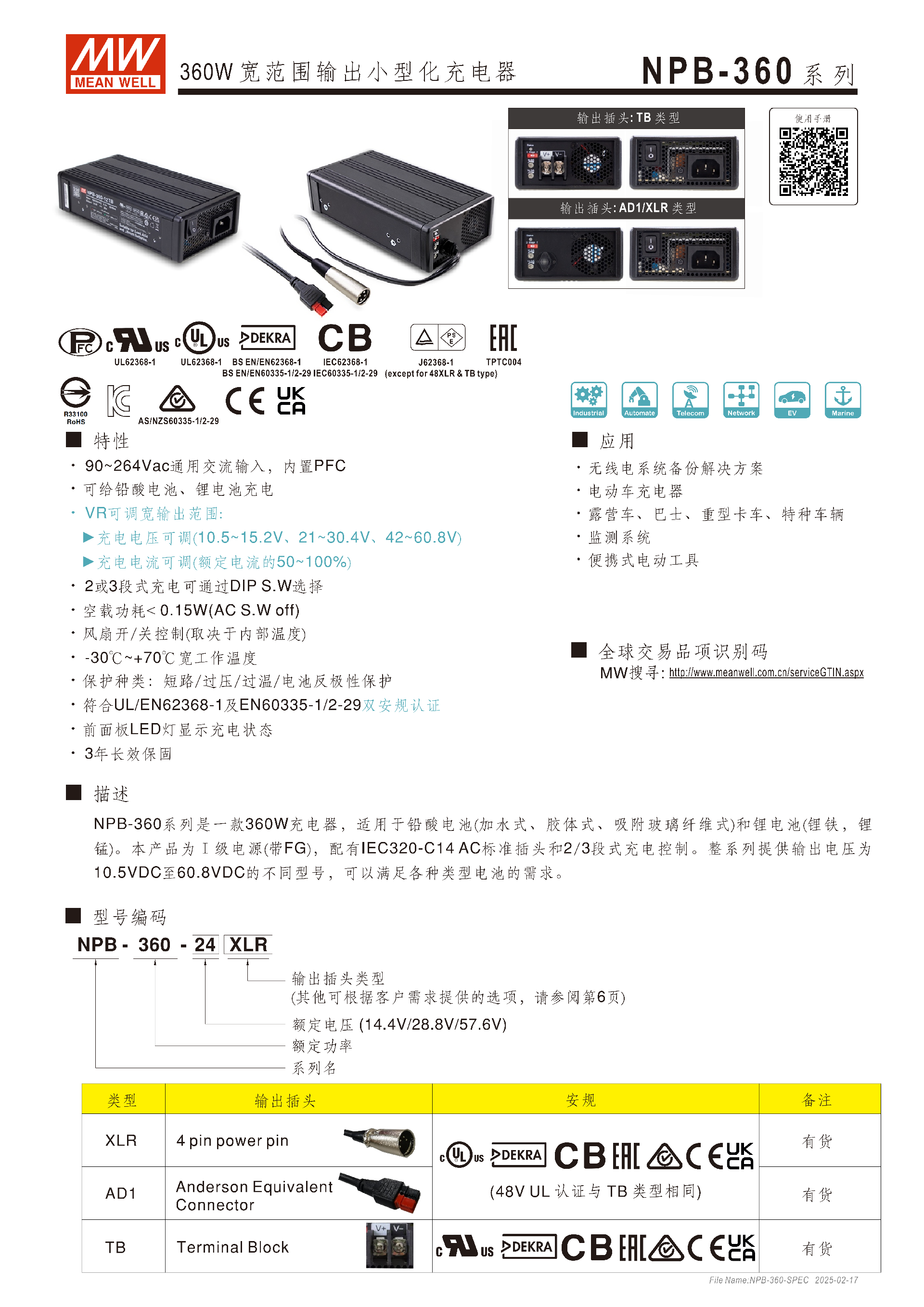 明緯 NPB-360 系列是 360W 寬范圍輸出小型化充電器,支持90~264VAC通用交流輸入,內(nèi)置 PFC,適配鉛酸電池和鋰電池,分12/24/48V三款核心機(jī)型,輸出插頭有 XLR、AD1、TB 三種類型且均有貨;具備電壓(10.5~60.8V)、電流(額定 50%~100%)可調(diào)特性,可通過 DIP 開關(guān)選擇 2/3 段式充電曲線(2 段適配鋰電、3 段適配鉛酸),擁有短路 / 過壓 / 過溫 / 電池反極性四重保護(hù),工作溫度寬至 **-30~+70℃,通過 UL/EN 等多國雙安規(guī)認(rèn)證,提供3 年保固 **,還具備空載功耗 < 0.15W、風(fēng)扇溫控、前面板 LED 狀態(tài)顯示等功能,廣泛應(yīng)用于無線電備份、電動車、特種車輛等場景。