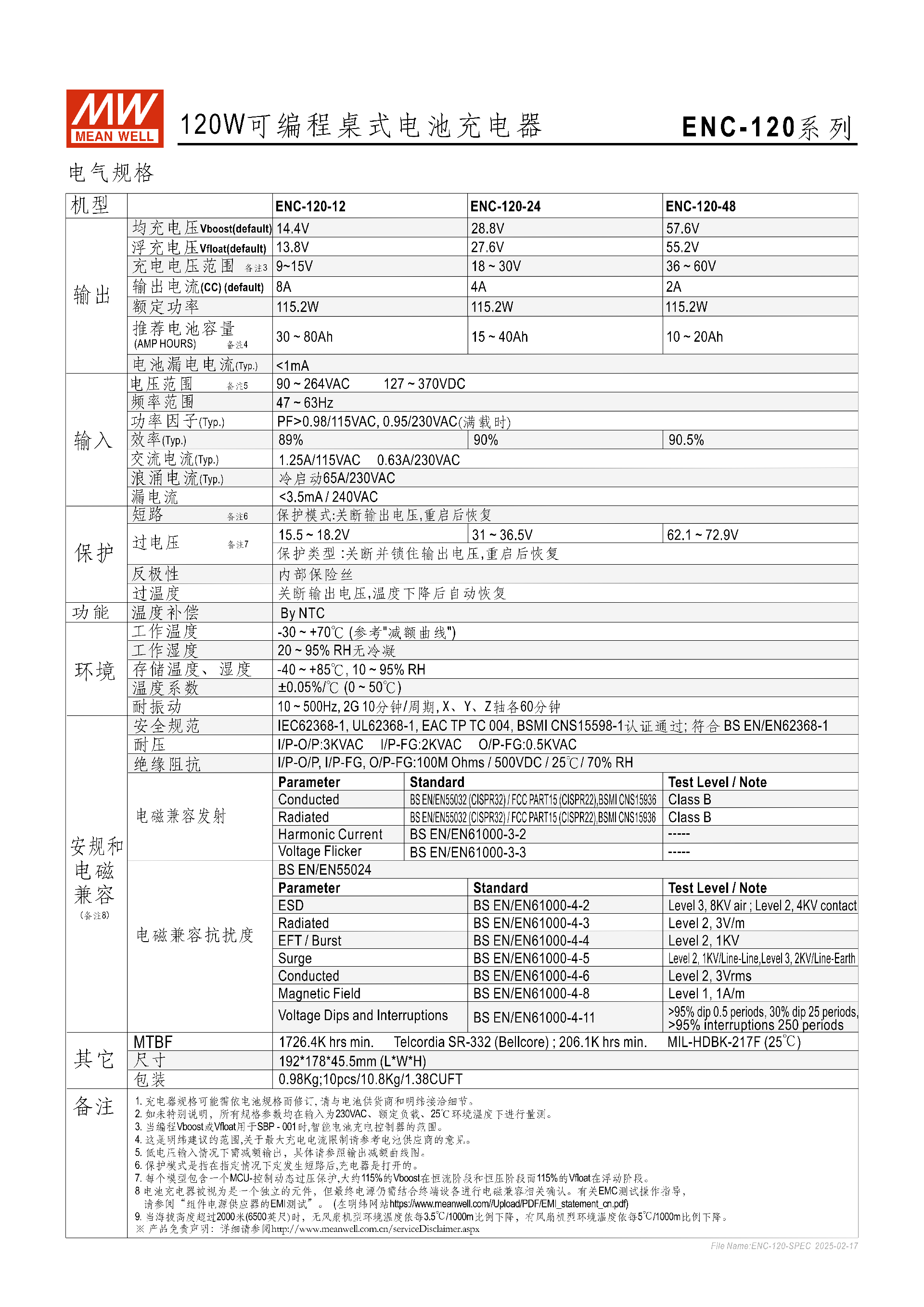 答案:ENC-120-12(12V)適配 10~20Ah 電池,默認(rèn)輸出 8A、均充 14.4V、浮充 13.8V;ENC-120-24(24V)適配 15~40Ah 電池,默認(rèn)輸出 4A、均充 28.8V、浮充 27.6V;ENC-120-48(48V)適配 30~80Ah 電池,默認(rèn)輸出 2A、均充 57.6V、浮充 55.2V,三款機(jī)型額定輸出功率均為 115.2W,效率隨電壓升高略有提升。