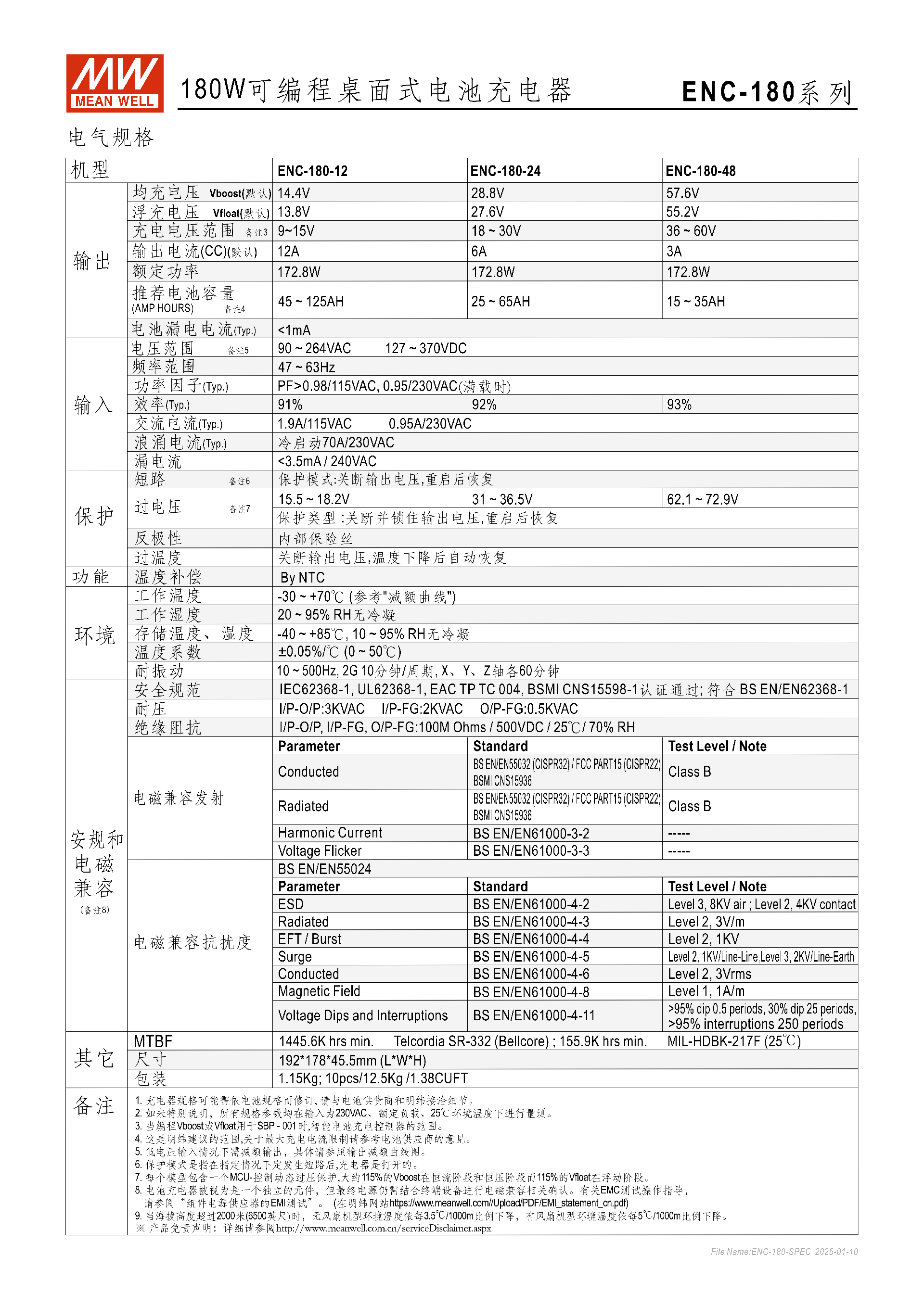 ENC-180 系列是明緯推出的180W 可編程桌面式 AC/DC 電池充電器,支持鉛酸蓄電池(膠體、加水、AGM 式)和鋰電池(鋰鐵、鋰猛)充電,具備三段式可編程充電曲線,擁有 12V/24V/48V 三款額定電壓機(jī)型,輸入為 90~264VAC 全范圍交流,采用無風(fēng)扇自然風(fēng)冷設(shè)計(jì),內(nèi)置主動(dòng)式 PFC、溫度補(bǔ)償及短路、反極性等多重保護(hù),工作溫度達(dá) **-30~+70℃**,通過多項(xiàng)國際安規(guī)認(rèn)證,MTBF 值最高達(dá) 1445.6K hrs,提供 3 年保固,適用于無線電系統(tǒng)備份、電動(dòng)自行車、監(jiān)控系統(tǒng)等場(chǎng)景。
