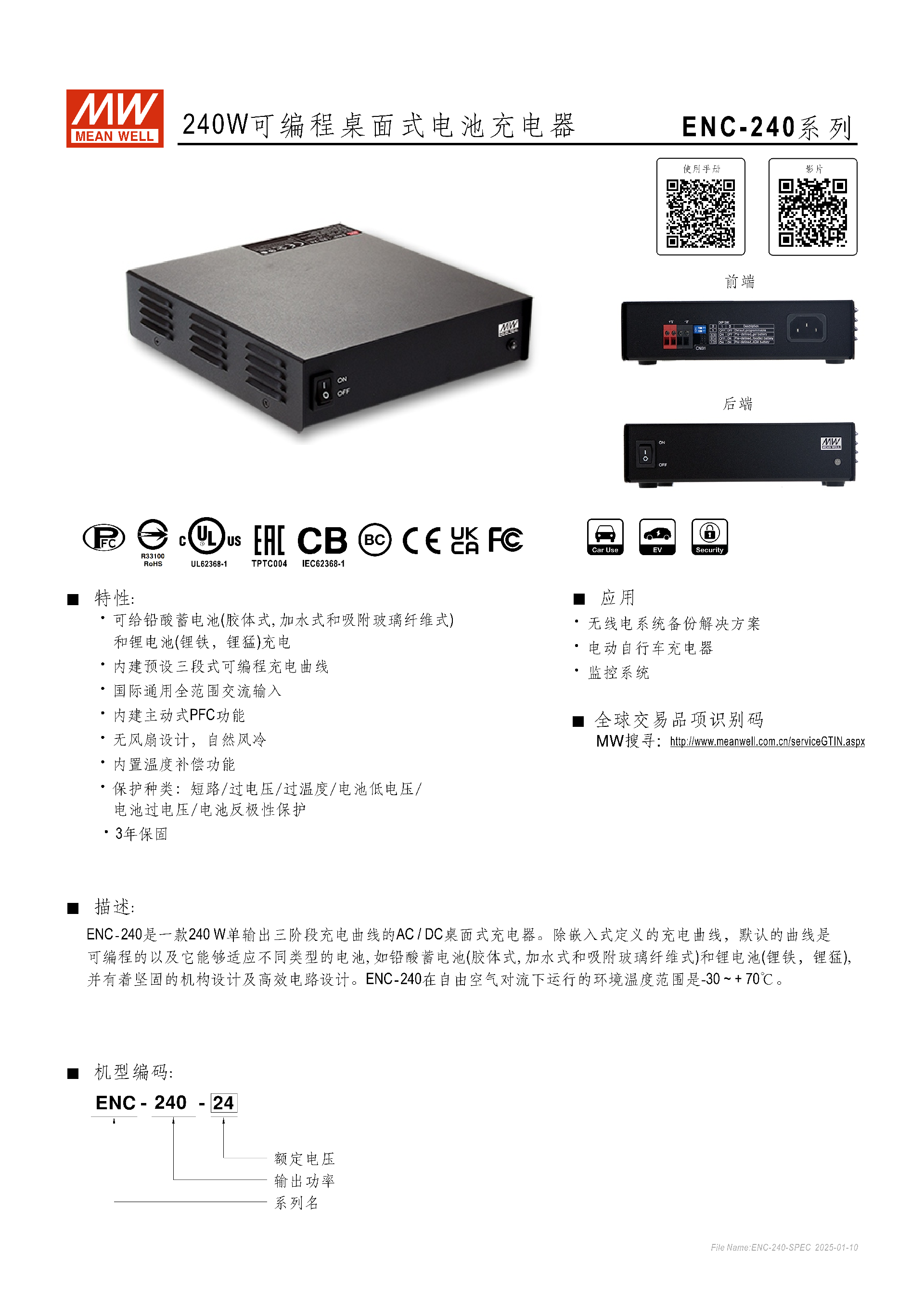 ENC-240 系列是明緯研發(fā)的240W 單輸出 AC/DC 桌面式電池充電器,核心為三段式可編程充電曲線設(shè)計(jì),兼顧通用性與定制化,適配多種電池類(lèi)型,采用無(wú)風(fēng)扇自然風(fēng)冷和高效電路設(shè)計(jì),結(jié)構(gòu)堅(jiān)固,提供3 年保固,是無(wú)線電系統(tǒng)備份、電動(dòng)自行車(chē)、監(jiān)控系統(tǒng)等場(chǎng)景的專(zhuān)用充電解決方案。