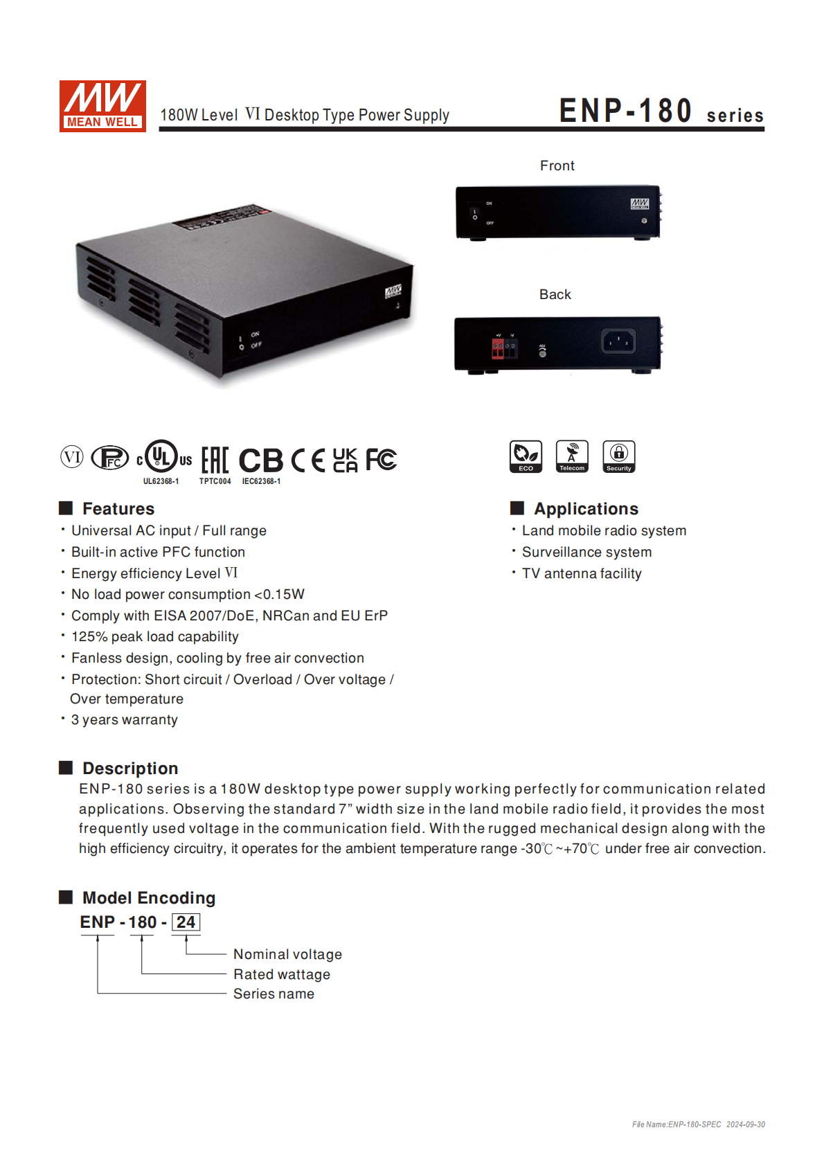 ENP-180 系列是明緯推出的180W Ⅵ 級桌式單組輸出電源,具備國際通用全范圍交流輸入、內(nèi)建主動式 PFC 功能,空載消耗 < 0.15W,無風(fēng)扇自然風(fēng)冷設(shè)計,擁有短路 / 過載 / 過電壓 / 過溫度四重保護且故障移除后可自動恢復(fù),適配 - 30~+70℃工作溫度,提供 12V/24V/48V 三種額定電壓版本,峰值負載能力達 125%(持續(xù) 3 秒),通過 IEC62368-1 等多項認證,適用于移動無線電、監(jiān)控系統(tǒng)等通信相關(guān)場景,享有3 年保固,機身尺寸為 19217845.5mm,采用端子 TB1 接線設(shè)計,電氣與電磁兼容性能優(yōu)異。