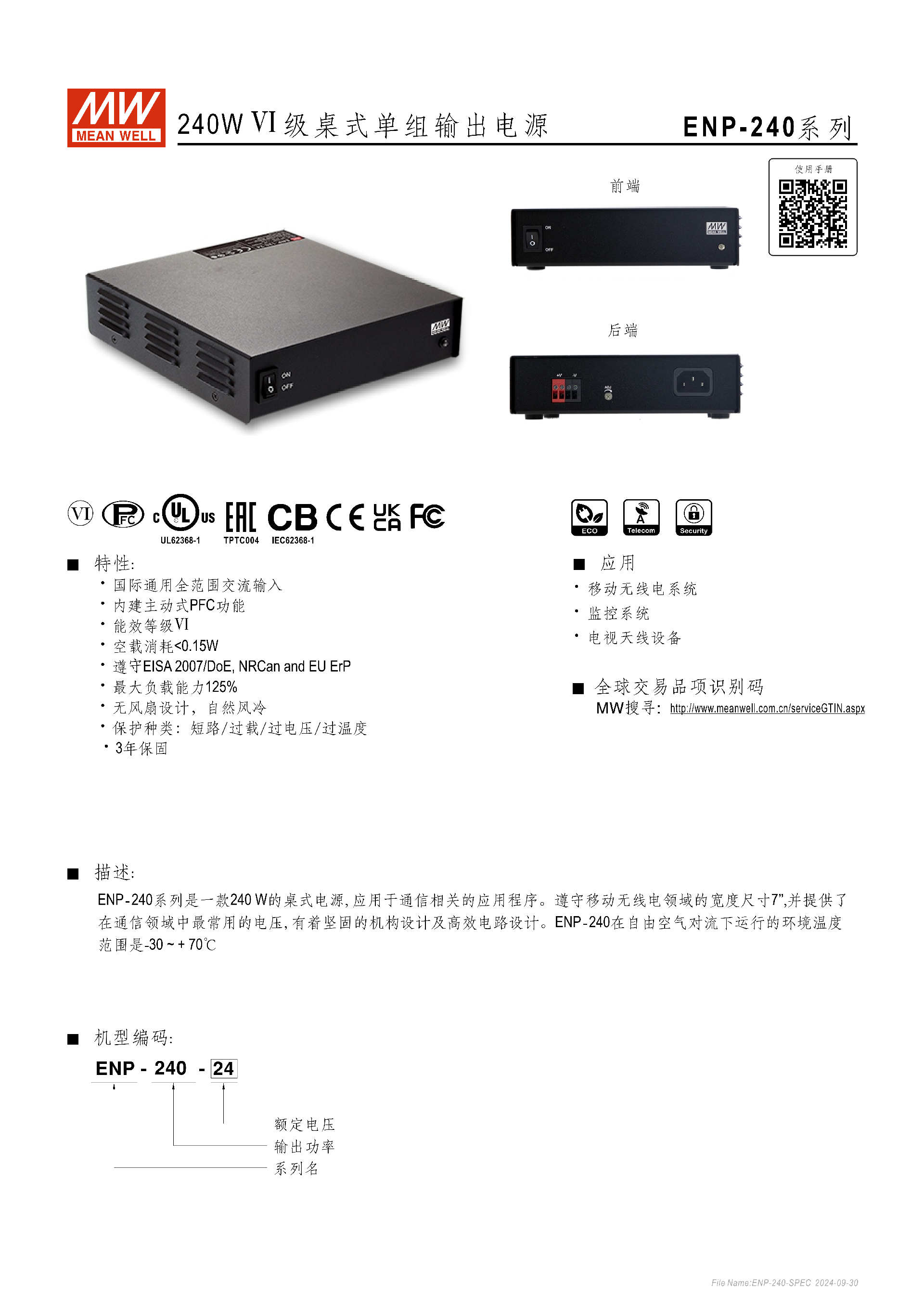 ENP-240 系列是明緯推出的240W Ⅵ 級桌式單組輸出電源,適配移動無線電、監(jiān)控系統(tǒng)等通信類應(yīng)用,具備國際通用全范圍交流輸入、內(nèi)建主動式 PFC、無風(fēng)扇自然風(fēng)冷設(shè)計(jì),擁有短路 / 過載等多重保護(hù)且可自動恢復(fù),工作溫度達(dá) - 30~+70℃,提供 12V/24V/48V 等輸出規(guī)格,峰值負(fù)載能力達(dá)125% 且可持續(xù) 3 秒,空載消耗 **<0.15W**,通過 IEC62368-1 等多項(xiàng)認(rèn)證,MTBF 值最低 1573.4K hrs,享有3 年保固,機(jī)身尺寸為19217845.5mm,機(jī)構(gòu)設(shè)計(jì)堅(jiān)固且適配通信領(lǐng)域 7?寬度尺寸要求。