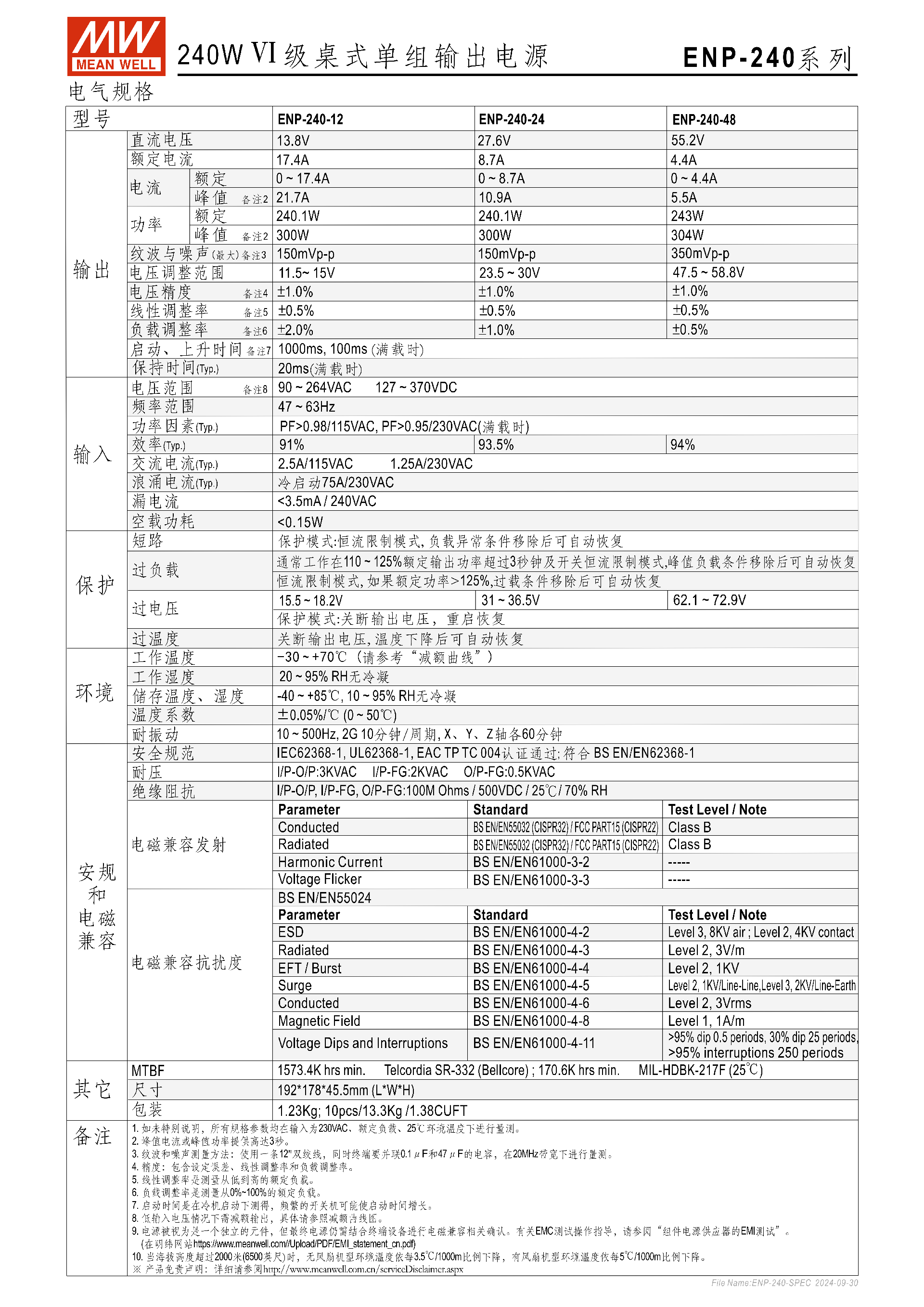 明緯 ENP-360 系列是 360W Ⅵ 級(jí)桌式單組輸出電源,具備國際通用全范圍交流輸入、內(nèi)建主動(dòng)式 PFC功能,空載消耗 <0.5W,無風(fēng)扇自然風(fēng)冷設(shè)計(jì),工作溫度達(dá) **-30 ~ +70℃,擁有短路 / 過載 / 過電壓 / 過溫度四重保護(hù)且可自動(dòng)恢復(fù),提供3 年保固 **;該系列分 12V/24V/48V 三款額定電壓機(jī)型,峰值負(fù)載能力達(dá)125% 且可持續(xù) 3 秒,機(jī)身尺寸19217845.5mm,適配移動(dòng)無線電、監(jiān)控系統(tǒng)等通信相關(guān)應(yīng)用,通過 UL62368-1 等多項(xiàng)安規(guī)認(rèn)證,電磁兼容與抗擾性均符合行業(yè)標(biāo)準(zhǔn)。