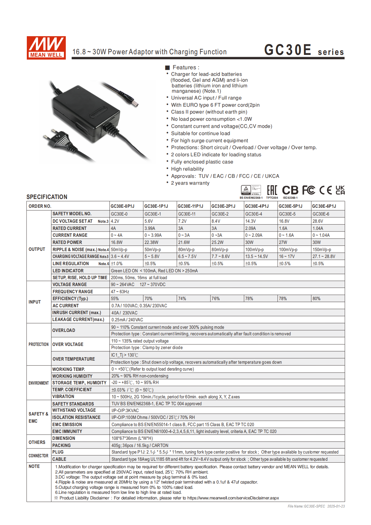 GC30E 系列是明緯推出的 16.8~30W 帶充電功能的電源適配器,支持90~264VAC/127~370VDC國(guó)際通用全范圍交流輸入,為 Class II 無(wú)接地電源,具備短路 / 過(guò)負(fù)載 / 過(guò)電壓 / 過(guò)溫度四重保護(hù)及紅綠色 LED 充電狀態(tài)指示,空載功耗 < 1.0W,輸出為 CC/CV 定電流電壓模式,適配多規(guī)格直流輸出(4.2V~28.6V),通過(guò) TUV/EAC/CB/FCC/CE/UKCA 等多項(xiàng)認(rèn)證,提供 2 年保固,機(jī)身尺寸1086736mm,適配連續(xù)性負(fù)載與高浪涌電流設(shè)備。