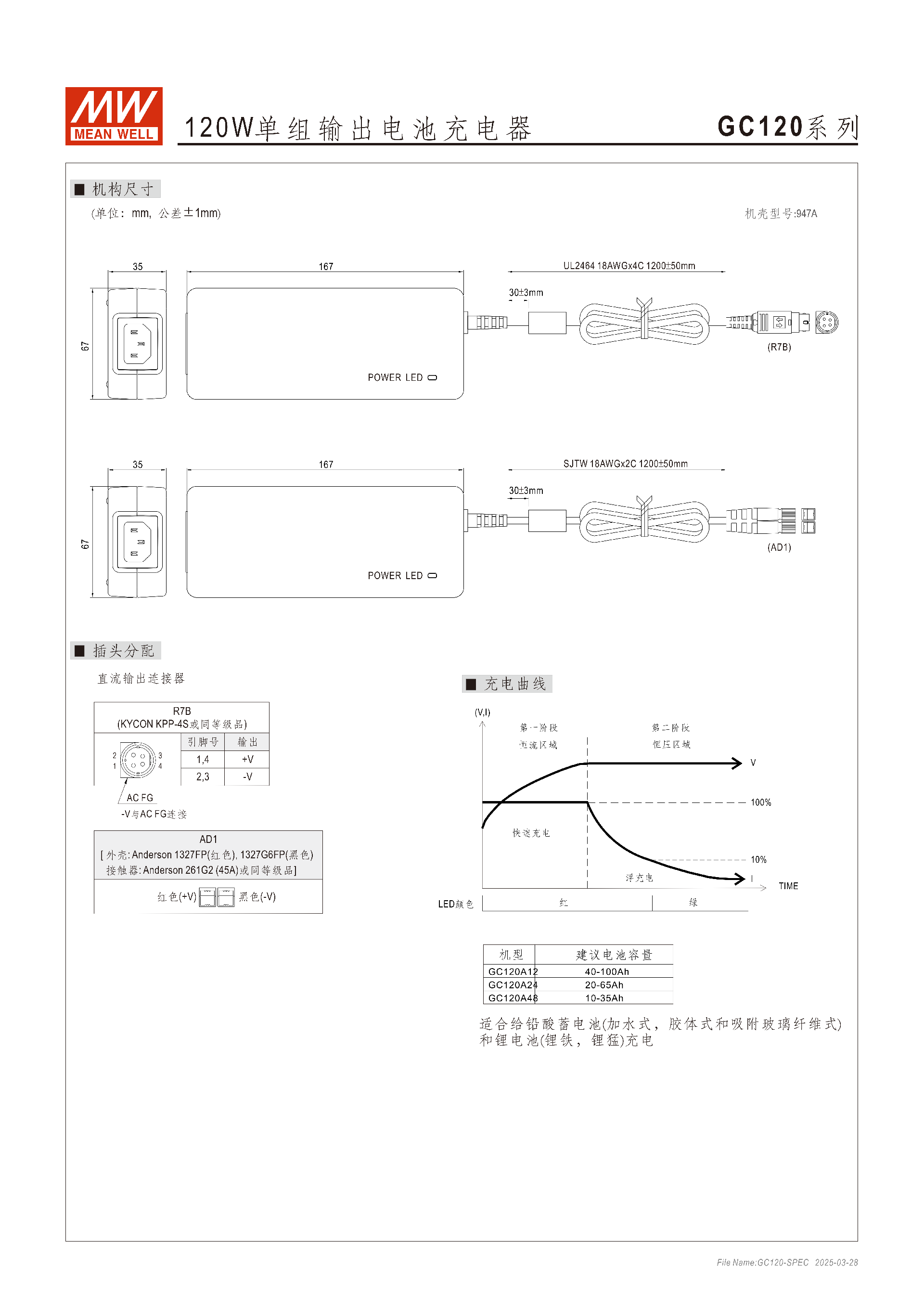 GC120 系列 120W 單組輸出電池充電器為明緯出品,支持鉛酸蓄電池(加水 / 膠體 / 吸附玻璃纖維式)和鋰電池(鋰鐵 / 鋰猛)充電,具備2 階充電特性與主動(dòng)式 PFC(PF>0.97),交流輸入為 85~264VAC/120~370VDC 的全范圍規(guī)格,擁有短路、過(guò)負(fù)載等多重保護(hù),采用自然風(fēng)冷與全封閉塑膠外殼,通過(guò) UL/PSE/TUV 等多項(xiàng)國(guó)際認(rèn)證,提供 2 年保固,有GC120A12/24/48三款核心型號(hào),對(duì)應(yīng)不同輸出電壓、電流及推薦電池容量,搭配 4pin power din 或 Anderson 兩種輸出連接器,工作溫度為 **-30~+70°C**,尺寸1676735mm,MTBF 值最高達(dá)2707.9K hrs。