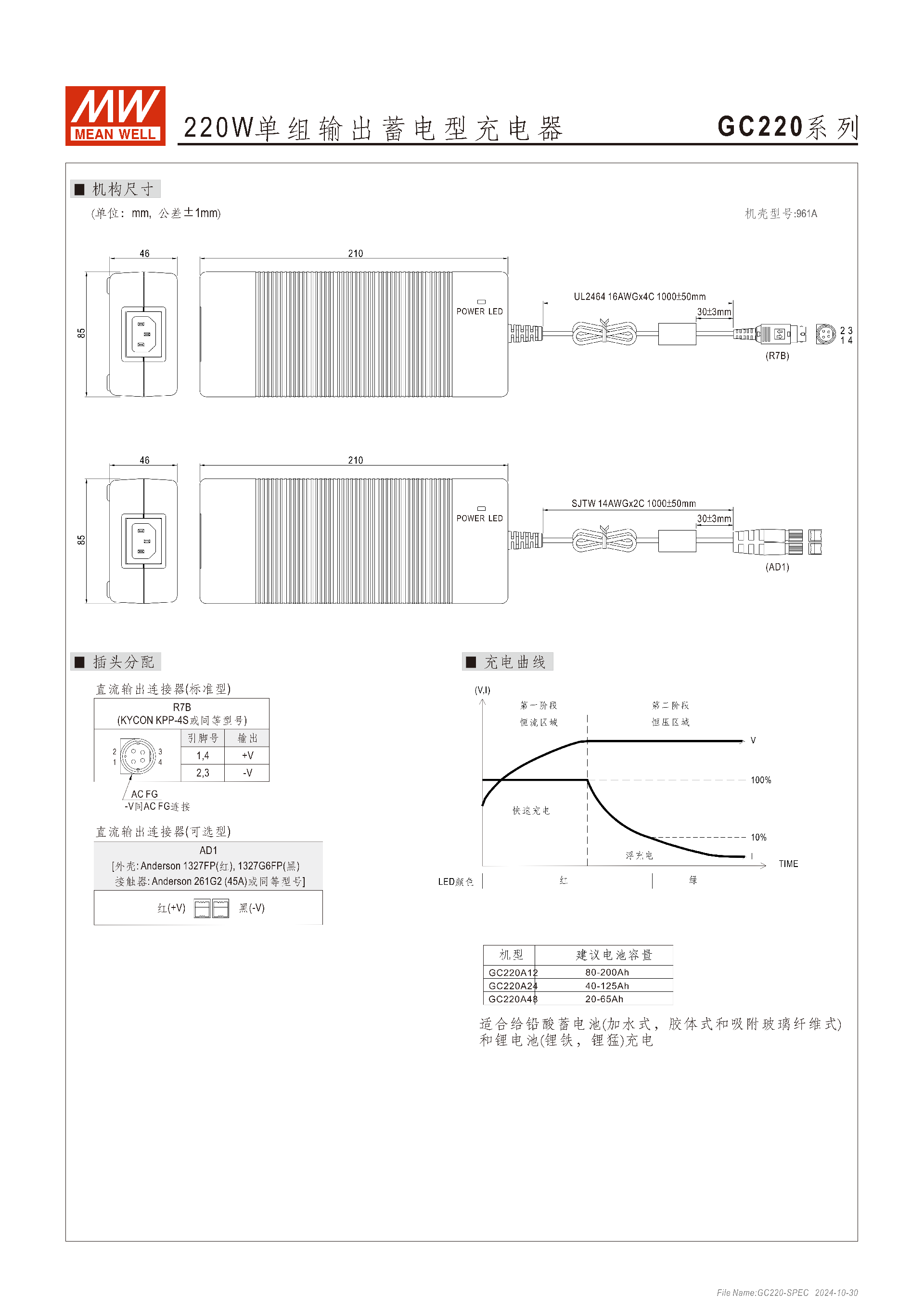 該系列按輸出連接器分標準型 GC220Axx-R7B和可選型 GC220Axx-AD1(xx=12/24/48,對應(yīng)輸出電壓規(guī)格),不同連接器的安規(guī)認證、配線規(guī)格不同,具體如下: