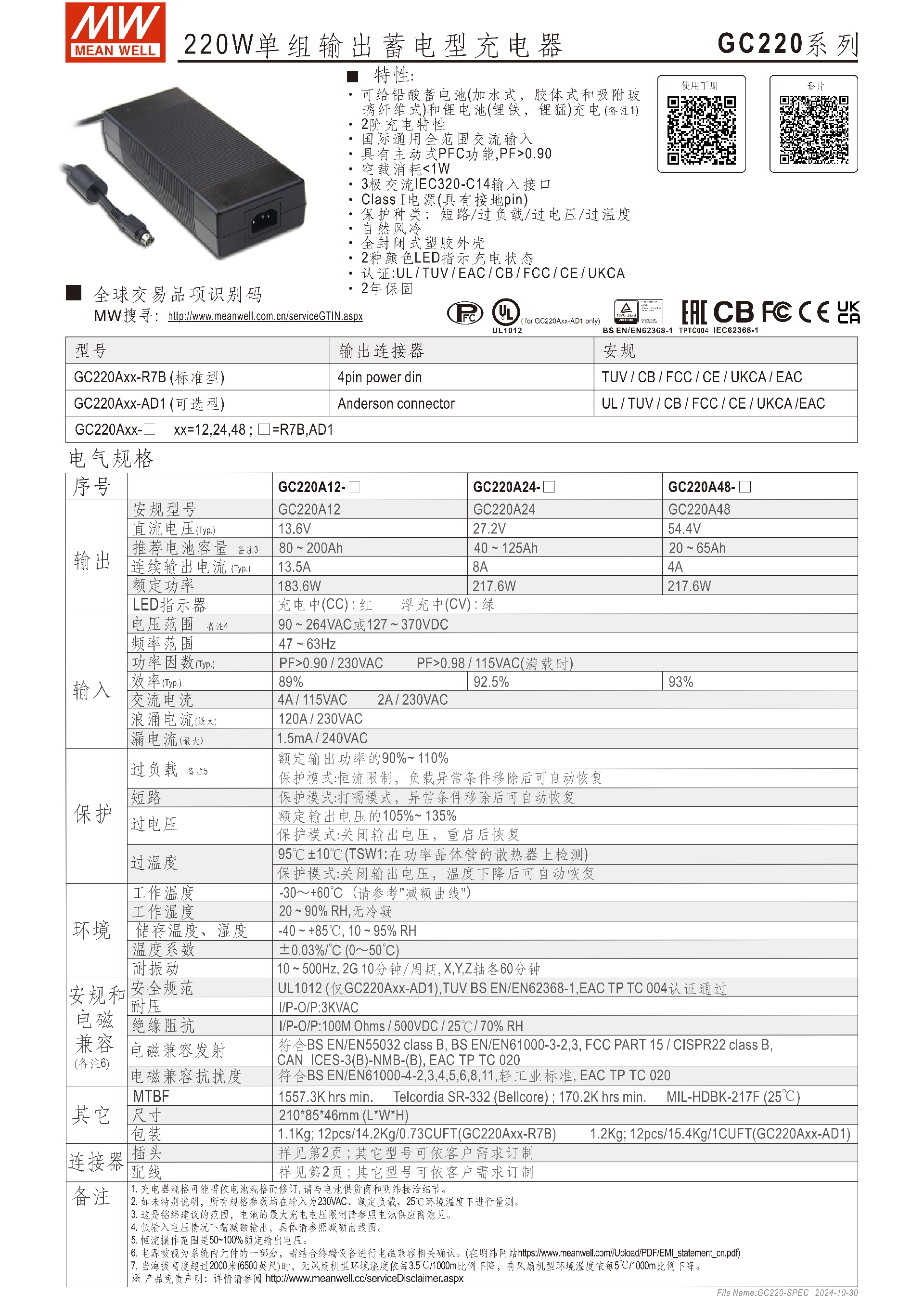 GC220 系列為220W 單組輸出蓄電型充電器,由明緯出品,主打蓄電池充電應(yīng)用,支持鉛酸蓄電池(加水式、膠體式、吸附玻璃纖維式)和鋰電池(鋰鐵、鋰猛)兩類電池,采用2 階充電特性,具備國際通用的全范圍輸入能力,通過多項國際安規(guī)與電磁兼容認證,提供2 年保固,整體為自然風冷、全封閉式塑膠外殼設(shè)計,適配工業(yè)及民用蓄電池充電場景。